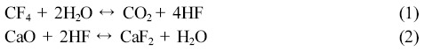 과불화화합물(PFCs, perfluorinated compounds)은 반도체 산업에서 증착(chemical vapor deposition, CVD), 식각(etching) 등 공정에 광범위하게 사용되고, 공급되는 PFCs의 약 10~50%가 미반응의 상태로 대기 중으로 방출되며 이는 주로 CF4, C2F6, C3F6, NF3 그리고 SF6 등을 포함한다.1 PFCs는 CFC(chlorofluorocompound)보다도 매우 수명이 길고 안정하여 대기에 그대로 방출될 경우 장기간 체류하게 되고 제거가 용이하지 않아 지구 온난화를 일으키는 물질로서, 이산화탄소에 비하여 연평균 증가율이 높고 지구온난화지수(global warming potential, GWP)가 5700~23900배 높아 세계적으로 사용규제가 강화되고 있어 이들의 분해제거 기술이 절실히 요구되어 왔다. 하지만, PFCs는 불소원자를 다수 포함하고 있기 때문에 어떠한 처리과정에서도 부산물로 부식성이 강하고 맹독성인 불화수소(HF)가 생성된다(eq. (1)).2-5 따라서 이를 제거하기 위한 공정이 필요한 상태이며, HF를 제거하기 위해 많은 연구들이 진행되어 왔고, 크게 건식제거법과 습식제거법으로 구분된다. 먼저, 습식제거법은 HF를 액체 상태인 알칼리용액으로 중화시켜 처리하는 방법으로 열에 의한 부식성이 더 강해져 시스템이 부식되어 내구성이 떨어지고 폐수 등의 2차 환경오염 문제가 발생한다. 따라서 건식제거법이 요구되고 있다.6 건식제거법은 고형흡착제를 이용하여 HF를 제거하는 방법이며, 고형흡착제로는 Ca계 물질 중에서 생석회로 잘 알려진 CaO가 일반적으로 적용되고 있으며, HF와 반응하여 불산제조 원천물질인 고순도의 CaF2를 생성함으로써 자원회수 및 재활용이 가능하기도 하다(eq. (2)).7-11 하지만, 반응을 위한 고온의 필요에 의해 공정이 복잡해지는 문제점을 갖는다. 따라서 본 연구팀에서는 이와는 다르게, 발생하는 HF를 고형환원제를 사용하여 지속적으로 제거함으로써 르샤틀리에의 원리에 의하여 평형을 파괴함으로써 반응온도를 낮춤과 동시에 HF를 효과적으로 제거할 수 있는 기술을 개발하기 위한 연구를 하였다. 이러한 일환으로 반응성과 효율성이 좋은 고형흡착제를 제조하고자 하였다.