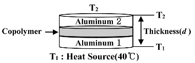 열전달 측정: 열전달 특성은 아래 그림과 같이 직접법으로 물체 내에 존재하는 온도차를 측정하여 평가하였다. 25 ℃ 항온실에서 40 ℃ 열원을 공급하는 판 위에 알루미늄 슬러그(Ф5 cm) 1을 올려놓은 다음, 알루미늄 슬러그 1 표면 위에 본 연구에서 합성한 아크릴레이트 공중합체를 30 µm 두께로 코팅 후 알루미늄 슬러그 2를 올려놓고 접착시켰다. 이때 일정한 열원이 공급되도록 하기 위해서 판 위의 4군데 모퉁이에 온도 센서를 설치하여 4군데의 평균 온도가 40 ℃를 유지하도록 전원 공급 장치를 조절하였다. 그 후 알루미늄 슬러그 2 표면 중앙에 온도센서 1개를 설치하여 온도 T2를 시간에 따라 측정하였다.