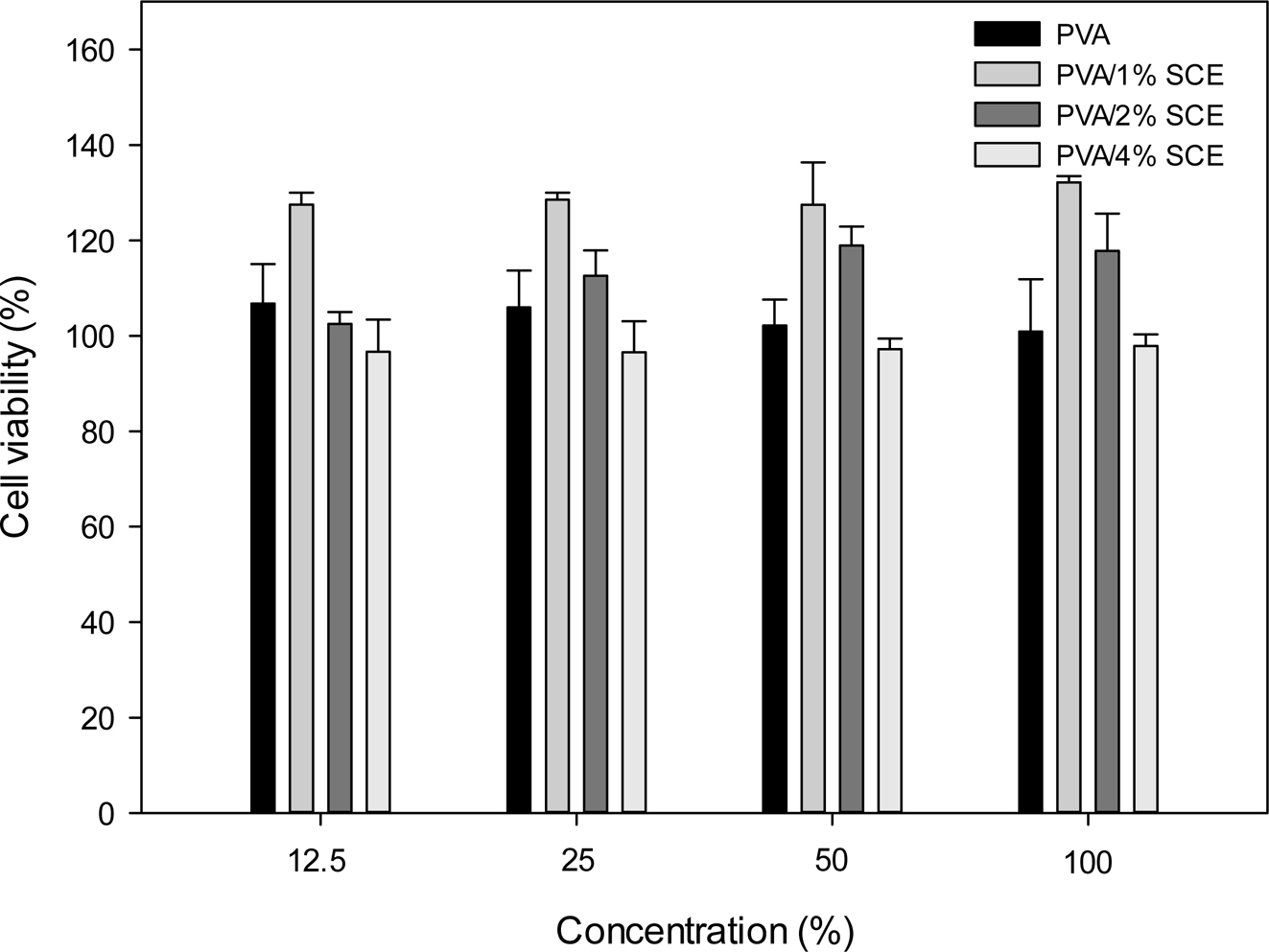 세포독성 평가. 세포 생존율을 측정하기 위해 MTT assay을 실시하였다. NIH-3T3 섬유아세포는 37 ℃, 5% CO2 incubator에서 배양하였으며 10% FBS와 1% Pen Strep이 첨가된 DMEM 배지를 사용하였다. 96 well plate에 배양된 NIH-3T3 세포를 5×104 cells/mL 만큼 분주하고 24시간 동안 배양하였다. ISO 10993-12에 의거하여 제조한 PVA/SCE 하이드로젤을 DMEM 배지에 담가 37 ℃에서 24시간 용출액을 사용하였다. 용출액을 농도별로 희석하여 배양된 세포에 처리하였다. 24시간 후 0.5% MTT(3-[4,5-dimethylthiazol-2-yl]-2,5-diphenyl tetrazolium bromide)용액을 각 well에 20 μL씩 처리하여 37 ℃에서 4시간 동안 배양하였다. 이 후 MTT 용액과 배지를 제거하고 DMSO 100 μL을 첨가한 후 ELISA reader(Bio-Tek, USA)을 이용하여 570 nm 파장에서 흡광도를 측정하였다.