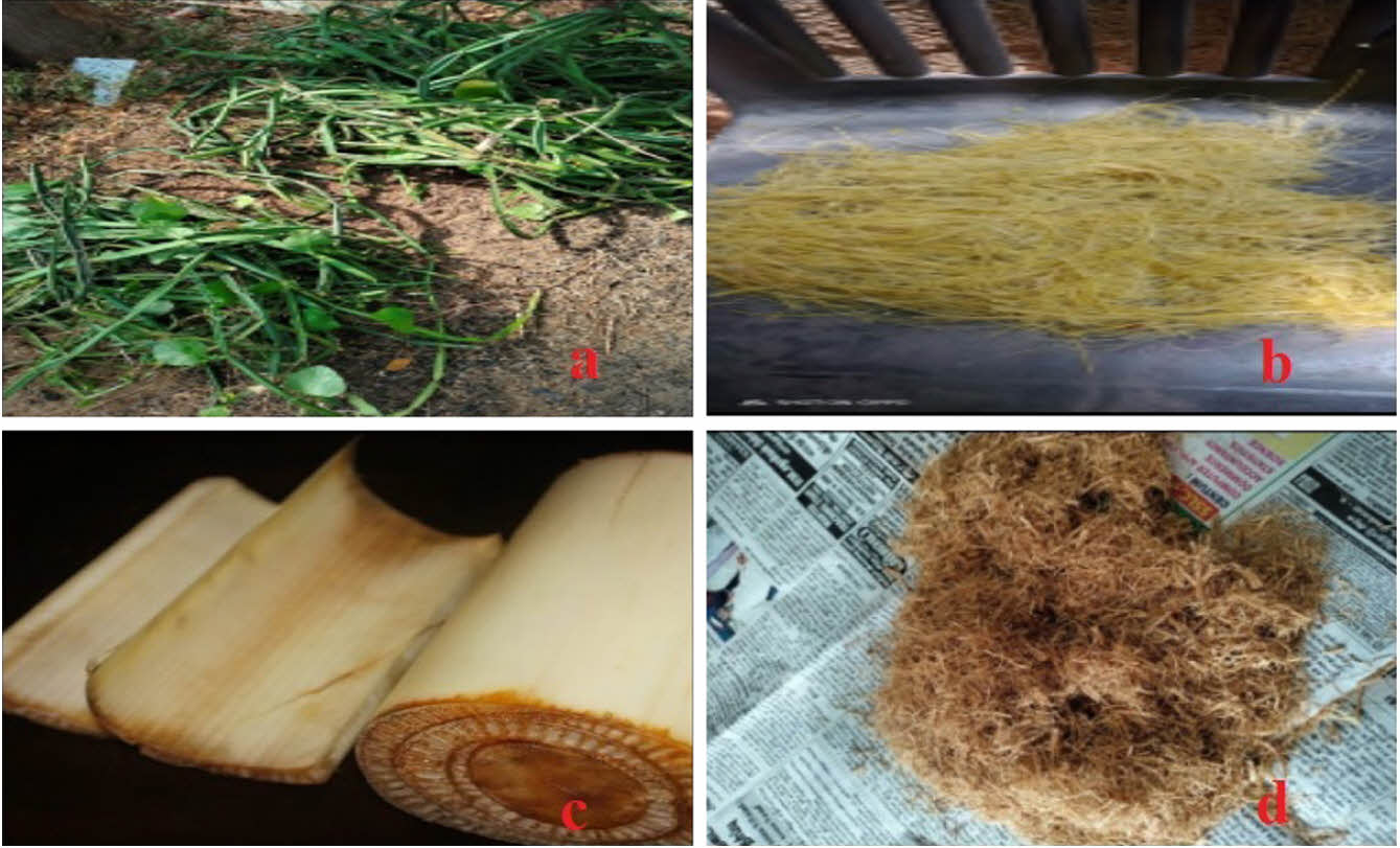 Figure 1 Fibre Extraction: (a) cisuss quadrangularis stem; (b) cissus quadrangularis fiber; (c) banana stem; (d) banana fiber. |