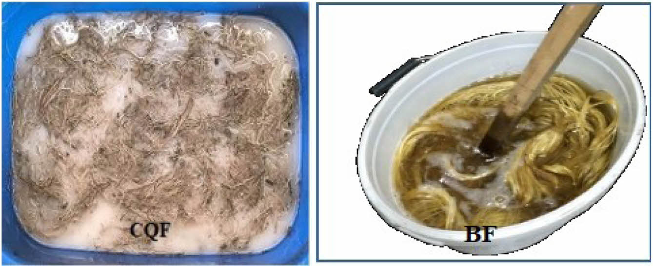 Fiber Treatment: To enhance the bonding of natural fibers with the epoxy matrix, an alkaline treatment was applied to both types of fibers. This process involved preparing a 5% calcium hydroxide (Ca(OH)2) solution by dissolving Ca(OH)2 in distilled water. The fibers were immersed in this solution for 2-3 days to remove impurities and increase surface roughness. After immersion, the fibers were thoroughly rinsed with distilled water to eliminate any residual Ca(OH)2, as shown in Figure 2. Finally, the cleaned fibers were dried at laboratory oven controlled temperature (36-38 ℃) for 1-2 days to ensure complete moisture removal.