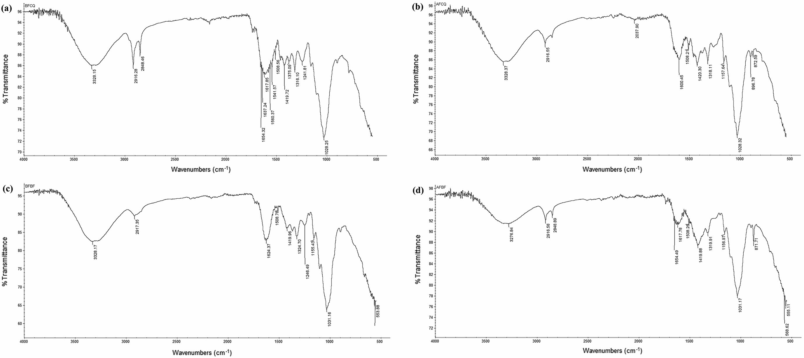 Figure 3 FTIR results of fibre treatments CQF: (a) before; (b) after BF; (c) before; (d) after |