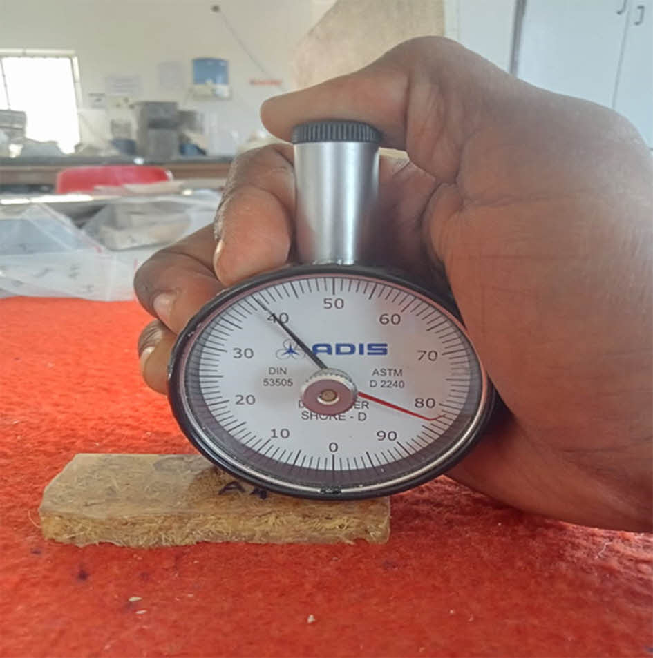 Mechanical Testing. Hardness Test: Hardness testing is a critical process for assessing a material's resistance to deformation, especially permanent indentation. In this particular series of tests, a Shore D durometer was used, an instrument specifically designed to measure the hardness of harder plastics and rubbers. The testing adhered strictly to the guidelines outlined in ASTM D2240, a standard that details the precise methodology and conditions for determining the hardness of samples using a durometer, as shown in Figure 8. The procedure involved taking ten distinct measurements at various locations on each sample. This method ensures that any potential variability across the sample surface is accounted for, providing a more comprehensive understanding of the material's hardness. After obtaining these measurements, the average value was calculated and recorded as the final hardness value for each sample.