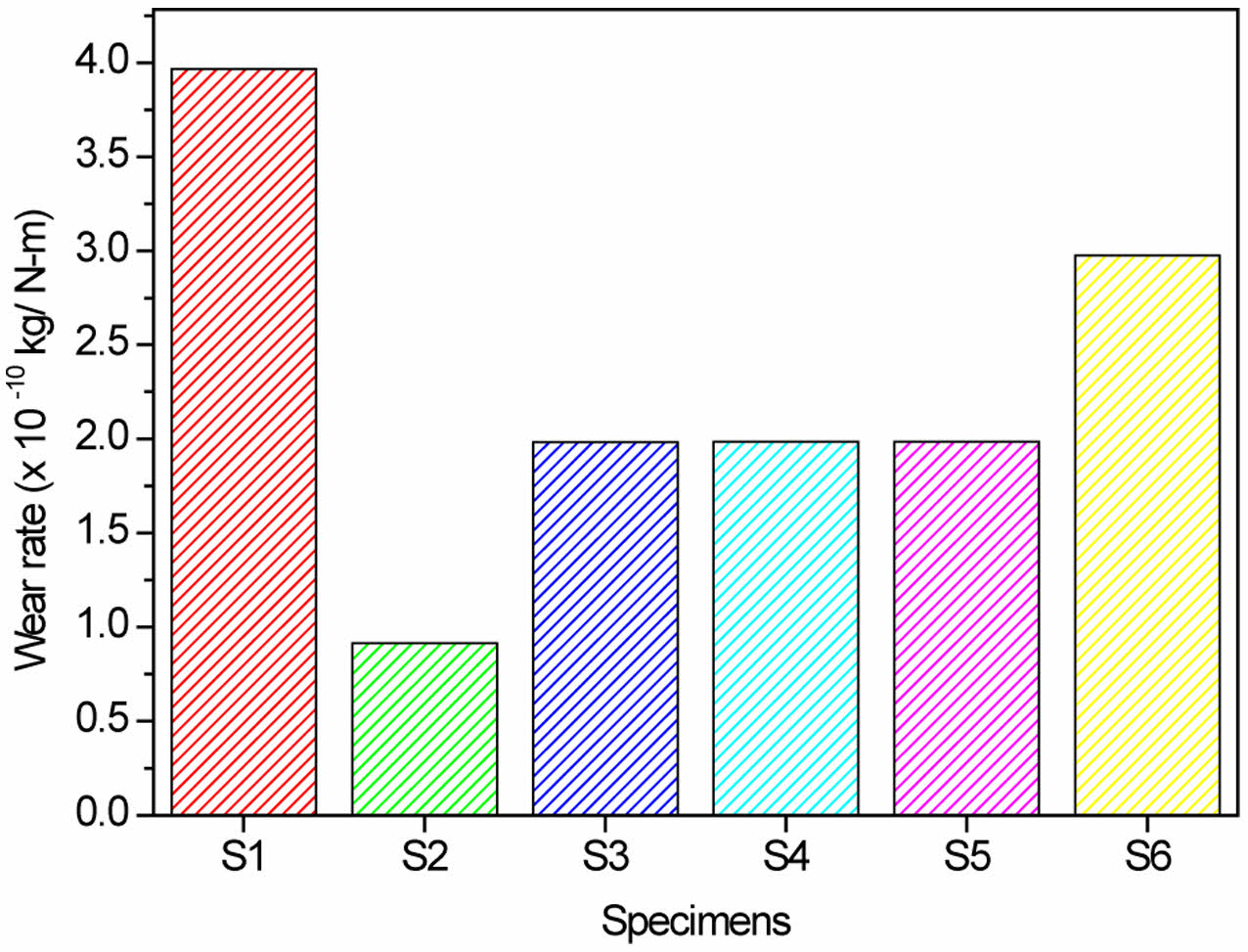 Wear Rate Analysis. The wear rates among the samples show that S2 has the lowest wear rate at 9.91505 × 10−10 Kg/Nm, indicating the highest resistance to wear. S3, S4, and S5 all share a wear rate of 1.98301 × 10−9 Kg/Nm, demonstrating good wear resistance but not as high as S2, S6, with a wear rate of 2.97451 × 10−9 Kg/Nm, has lower wear resistance compared to S3, S4, and S5. S1 exhibits the highest wear rate at 3.96602 × 10−9 Kg/Nm, indicating the least resistance to wear. The results of specimen hardness are shown in Table 3 and Figure 11.