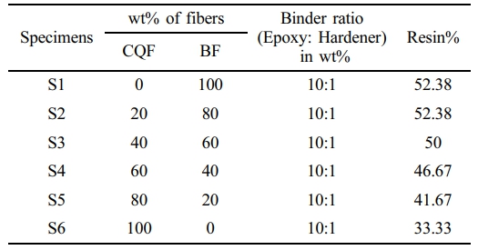 Composite Fabrication. The composite fabrication process began with the preparation of fibers, where treatedfibers were cut into 6 mm lengths. Following this, the epoxy resin and hardener were mixed in a weight ratio of 10:1, adhering to the manufacturer's instructions. During the composite mixing stage, the fibers were evenly distributed within the epoxy resin mixture, by varying a fiber ratio of in sample weight percentage were shown in Table 2. The composite fabrication process began with the preparation of fibers, where treated fibers were cut into 6 mm lengths. Following this, the epoxy resin and hardener were mixed in a weight ratio of 10:1, adhering to the manufacturers instructions. During the composite mixing stage, the fibers were evenly distributed within the epoxy resin mixture, by varying a fiber ratio of in sample weight percentage were shown in Table 2. Subsequently, the mixture is mixed by mechanical stirrer and it was poured into a mould with dimensions of 80 × 25 × 10 mm using the hand lay-up method shown in Figure 6. Figure 7 Shows the prepared composite specimens (80 × 25 × 10 mm) of CQF and Banana chopped Fibers with different weight percentage as shown in Table 2 and the samples are allowed to cure at room temperature at 33 ℃ for 3 days. Six sample compositions were prepared with varying ratios of CQF (0, 20, 40, 60, 80, and 100% respectivey). Here the samples are named as S1, S2, S3, S4, S5, and S6.