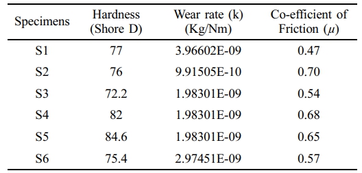 Coefficient of Friction Analysis. The coefficients of friction for the samples indicate varying levels of resistance to sliding. S2 has the highest coefficient of friction at 0.70, indicating the most resistance to sliding, followed closely by S4 at 0.68 and S5 at 0.65. S6 shows moderate frictional properties with a coefficient of friction of 0.57, while S3 also has a moderate value of 0.54. S1 has the lowest coefficient of friction at 0.47, indicating the least resistance to sliding. .The results are shown in Table 3 and Figure 12.
