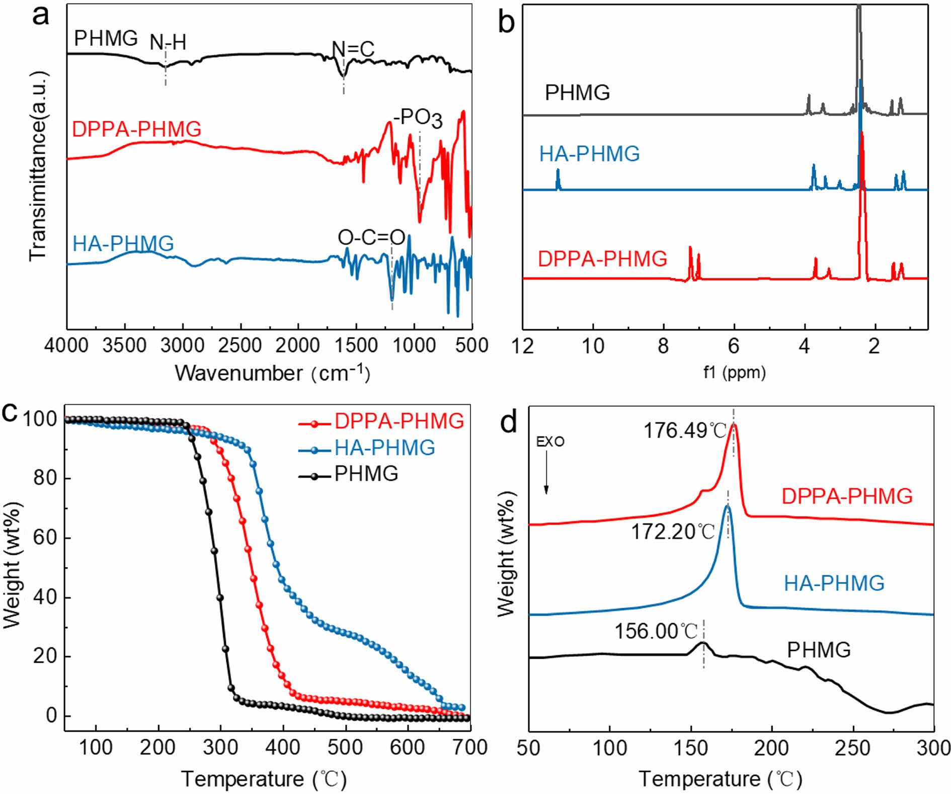 Characterization of smaples by: (a) FTIR; (b) 1 H NMR; (c) TG; (d) DSC spectra of PHMG, DPPA-PHMG, and HA-PHMG.