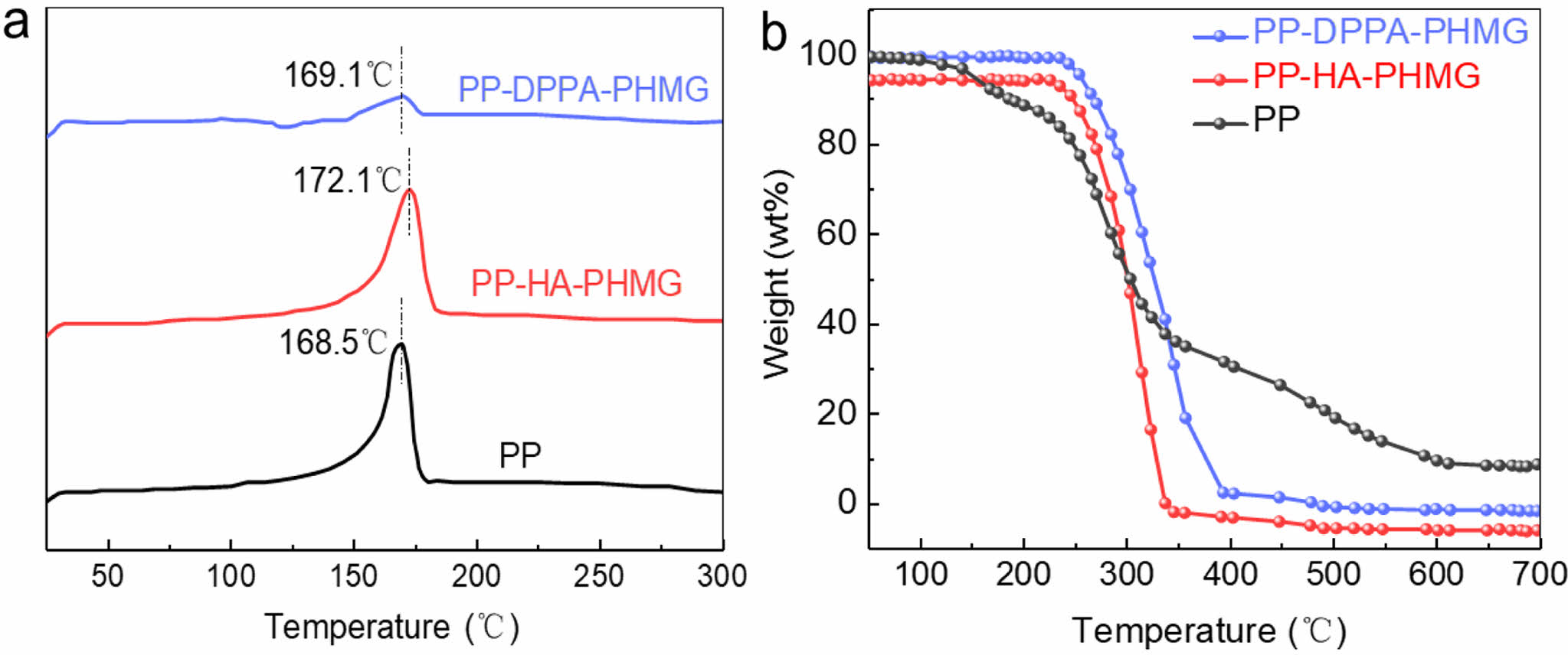 (a) DSC; (b) TG curves of PP, PP-HA-PHMG, and PP-DPPA-PHMG masterbatches.