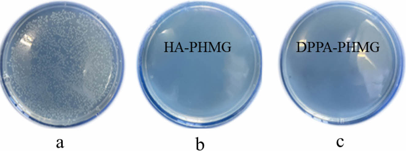 Digital photography of petri dishes after antimicrobial experiments of E. coli by: (a) PP; (b) HA-PHMG-PP; (c) DPPA-PHMGPP membranes.