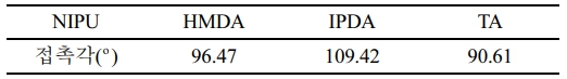 피마자유 기반 NIPU 필름의 접촉각 분석. 피마자유 기반 무용제성 NIPU 필름을 합성한 후, 각각의 접촉각 분석을 통해 소수성을 확인하였다. NIPU는 우레탄 사슬에 수산기를 가지고 있어 친수성을 띄는 것으로 알려져 있으나 합성된 NIPU 필름은 Table 2에서 보는 바와 같이 최소 90.61°, 최대 109.42°의 접촉각으로 소수성을 지니는 것을 확인하였다. 특히, IPDA-NIPU는 IPDA의 소수 특성으로 인해 더 큰 접촉각을 나타내었다. Figure 9