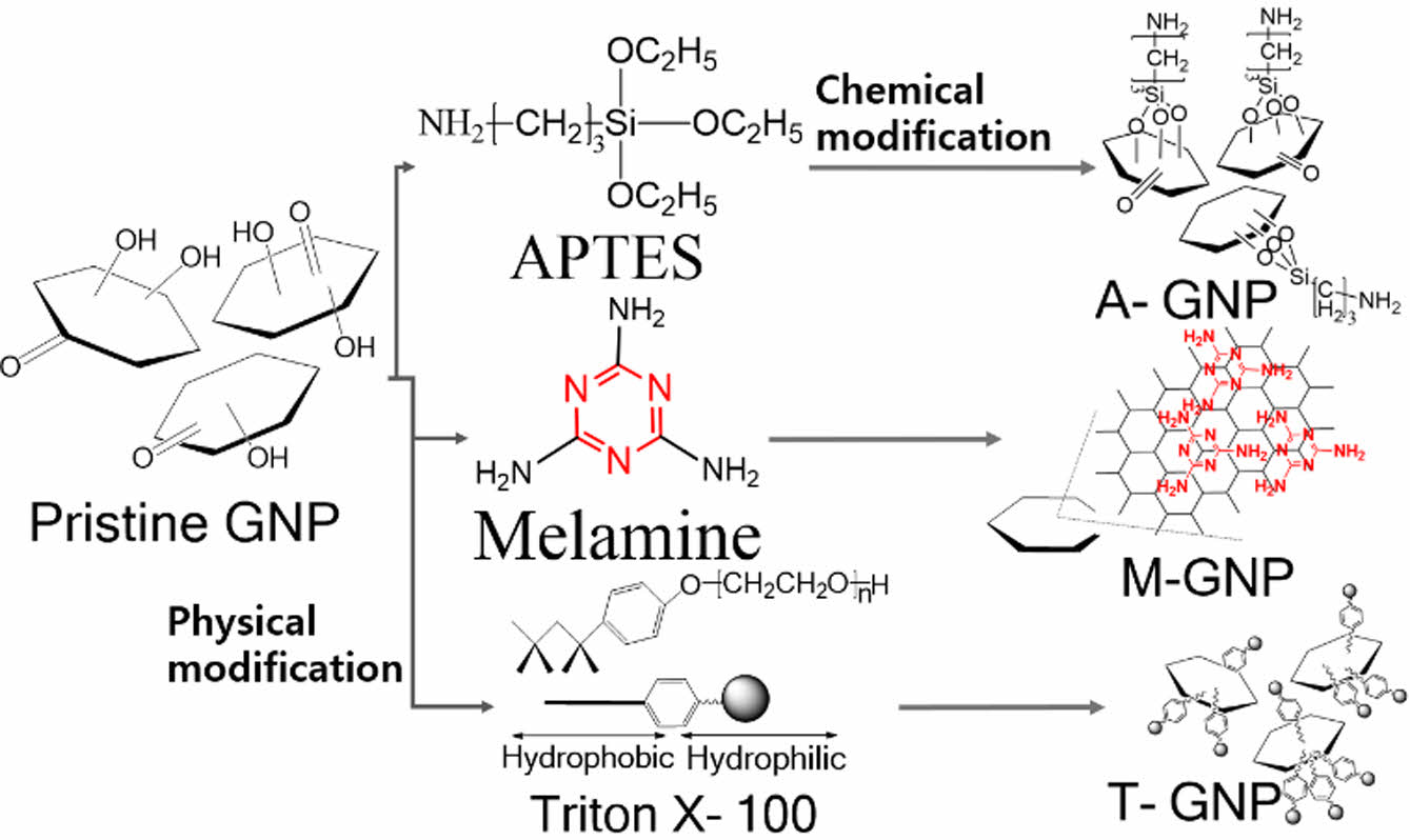 GNP 개질. GNP와 멜라민을 질량비 1:1로 DMF 용액 내에서 2시간 동안 초음파공정처리를 거친 후 진공 여과하여 80 ℃ 오븐에서 24시간 건조하였으며 MG로 명명하였다. 다음으로 GNP를 APTES와 1:1.5의 비율로 에탄올-물 혼합물 (비율 3:2)에 첨가하고 1시간 초음파 처리 후 75 ℃의 온도로 12시간 동안 교반하여 실란화 과정을 거치고 80 ℃ 오븐에서 24시간 건조하였으며 AG로 명명하였다. 마지막으로 GNP와 Triton X-100을 1:1 질량비로 물에 첨가하여, 1시간 초음파 처리 후 65 ℃에서 12시간 동안 교반하여 Triton X-100이 GNP 표면에 충분히 흡착되도록 하였으며, 80 ℃의 진공 오븐에서 12시간 건조시켜 TG로 명명하였고, GNP 개질에 대한 모식도를 Figure 1에 나타내었다.