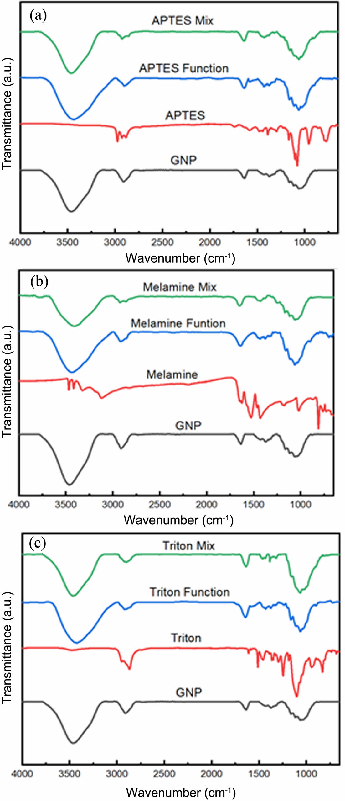 Figure 2 FTIR spectra of modified GNPs: (a) APTES; (b) MG; (c) TG. |