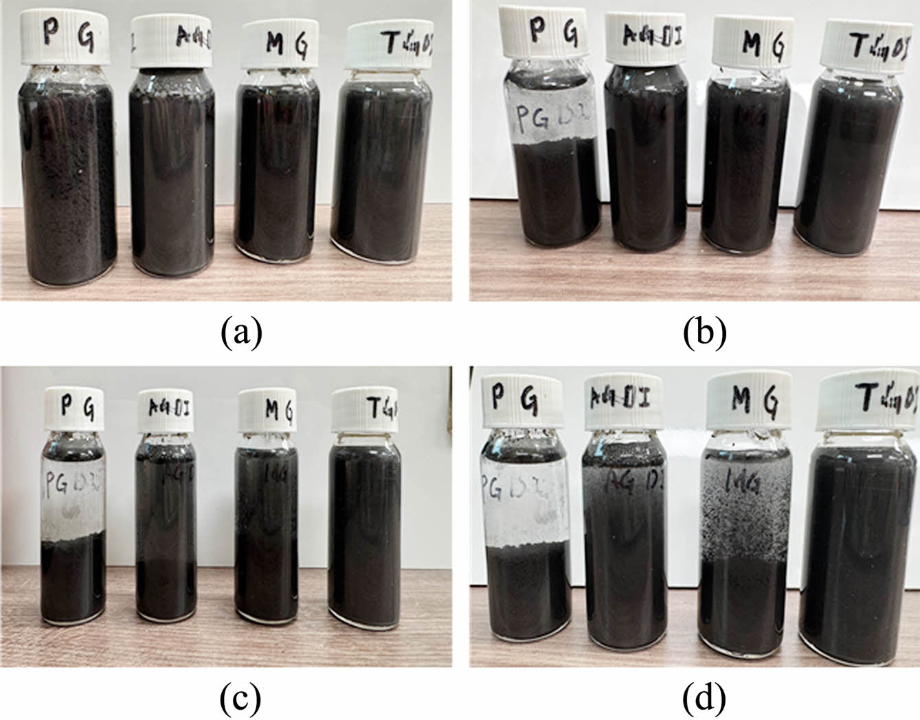 Figure 3 Water dispersion of GNPs after 1-Hour ultrasonication as a function of time: (a) 0 h; (b) 1 h; (c) 5 h; (d) 10 h. |