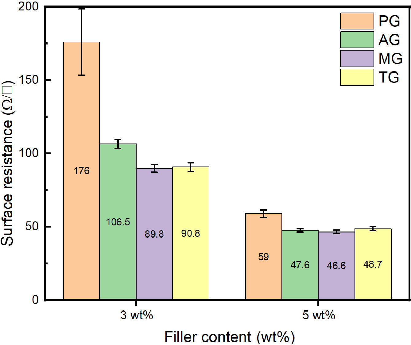 Figure 4 Surface resistance of PA 6/carbon filler composites with different GNP types. |