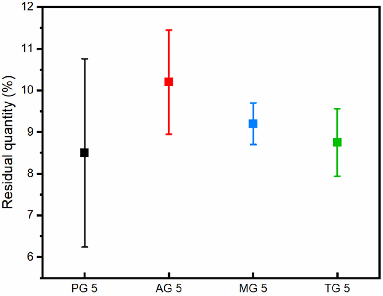 Figure 5는 복합체 5개의 TGA 열분해 잔량 및 오차 범위를 나타낸 것이다. 평균 값을 기준으로 편차가 작을수록 GNP의 분산이 우수한 것으로 해석할 수 있다. 순수 GNP가 적용된 복합체의 편차는 크게 나타나는 반면 개질된 GNP가 적용된 복합체의 편차는 감소하는 것을 알 수 있으며 MG 개질된 복합체의 편차가 제일 적어서 분산성이 가장 우수함을 유추할 수 있었다.