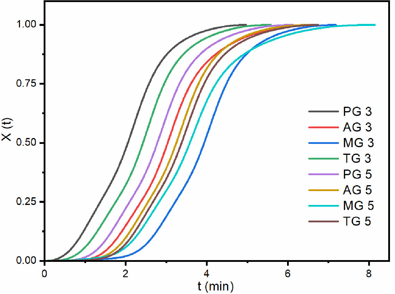 개질 GNP를 적용한 PA 6/탄소필러 복합체의 Avrami 수식에 의한 상대 결정화도에 대한 결과를 Figure 6에 나타내었다. 상대결정화도는 결정화곡선의 시간 t 까지의 면적을 전체면적으로 나눈 값이며, 시간은 온도를 냉각속도로 나눈 값이다.19-21