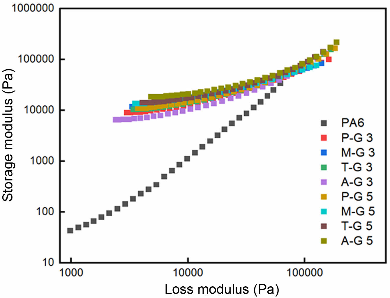 Figure 7 G'-G'' plots of PA 6/carbon filler composites. |