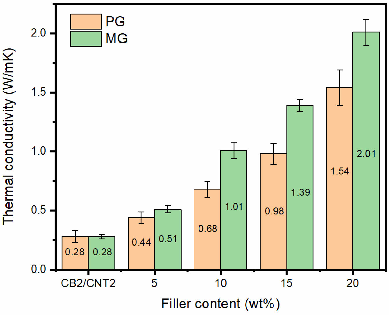 Figure 8 Thermal conductivities of PA 6/carbon filler composites as a function of MG modified GNP content. |