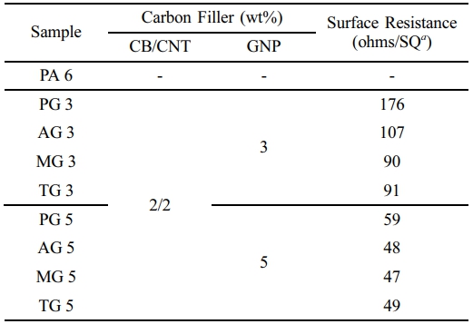 복합체 제조. PA 6와 탄소필러는 80 ℃ 오븐에서 12 시간 이상 건조한 후, 필러 함량 및 종류에 따라 이축압출기(Twin extruder, 바우테크사 A-19, L=760 mm, D=19 mm, L/D=40, Korea)를 이용하여 250/260/280/280/280/270 ℃, 70 rpm 조건에서 복합체를 제조하였다. 본 연구실의 기계적/전기적 특성연구에서 진행한 연구결과를 참조하여12 CB와 CNT를 각각 2 wt%로 고정하고 GNP의 종류별로 3과 5 wt%로 하여 PA 6/탄소필러 복합체를 제조하였다. 시료명에 순수 GNP 적용 복합체는 PG, APTES 개질 GNP 적용 복합체는 AG, 멜라민 개질 GNP 적용 복합체는 MG, Triton 개질 GNP 적용 복합체는 TG로 표시하였으며. 뒤에 숫자는 GNP의 함량을 의미한다. Table 1에 위에 언급한 시편의 조성 및 표면저항 값을 나타내었다.