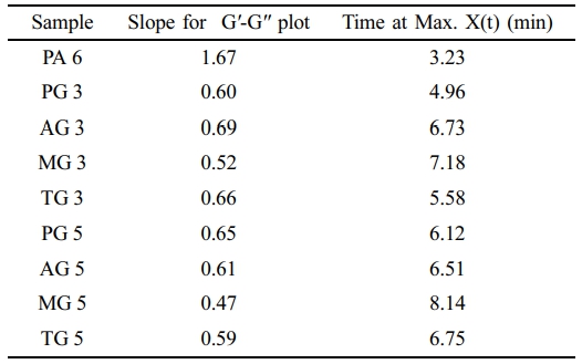 마지막으로 유변학적 특성에 따른 분산성 정도를 확인하기 위해 저장탄성률(G')-손실탄성률(G'') 그래프 기울기를 분석하였다. Figure 7은 복합체의 G' vs. G'' 그래프를 나타내는 것이다. TGA 잔량 편차와 상대 결정화도 도달시간 분석 결과와 마찬가지로 MG 개질 된 복합체의 기울기가 가장 적게 나타났으며, 이는 GNP의 분산성 개선으로 용융상태에서 탄성특성이 증가함에 따른 것으로 해석할 수 있다. 복합체의 G' vs. G'' 그래프 기울기 값 및 최대 상대결정화도 도달시간을 Table 2에 정리하였다.