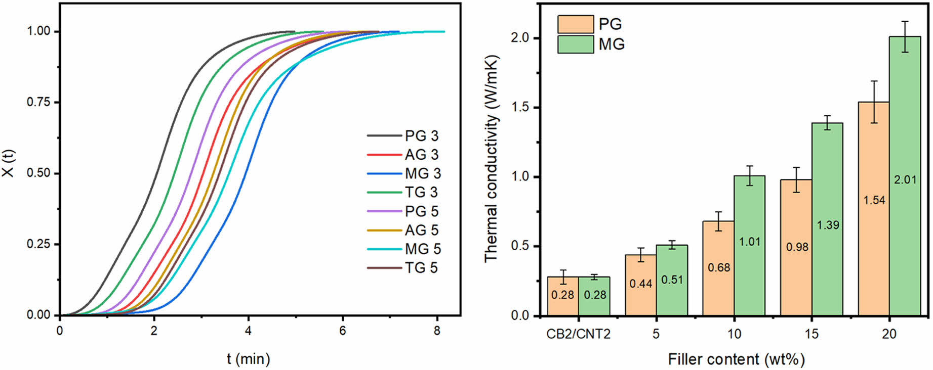 동적유변학적특성의 저장탄성률(storage modulus, G') vs. 손실탄성률(loss modulus, G'') 그래프 분석에서 균일 고분자 용융상에서는 기울기가 2에 근접하지만 무기 필러가 도입되면 탄성 특성의 증가로 기울기가 감소하며, 필러 분산성이 증가하면 고분자 용융상에 탄성특성 증가 효과를 가져와 기울기가 감소하는 것으로 알려져 있다.12 분산성 평가에 대한 또 다른 방법으로는 Avrami 결정화거동 분석에서 무기필러 첨가되면 매트릭스 내 사슬운동을 억제하여 상대결정화도 도달 시간이 증가하게 된다.13 또한 무기필러의 분산성이 개선되면 고분자 매트릭스 내에 필러가 고르게 분산되고 열중량분석에서 무기 필러 잔량에 대한 편차가 줄어들게 될 것으로 예측된다. 본 연구에서는 위에 언급한 3가지 방법을 GNP 분산성에 대한 평가 방법으로 사용하고자 하였다.