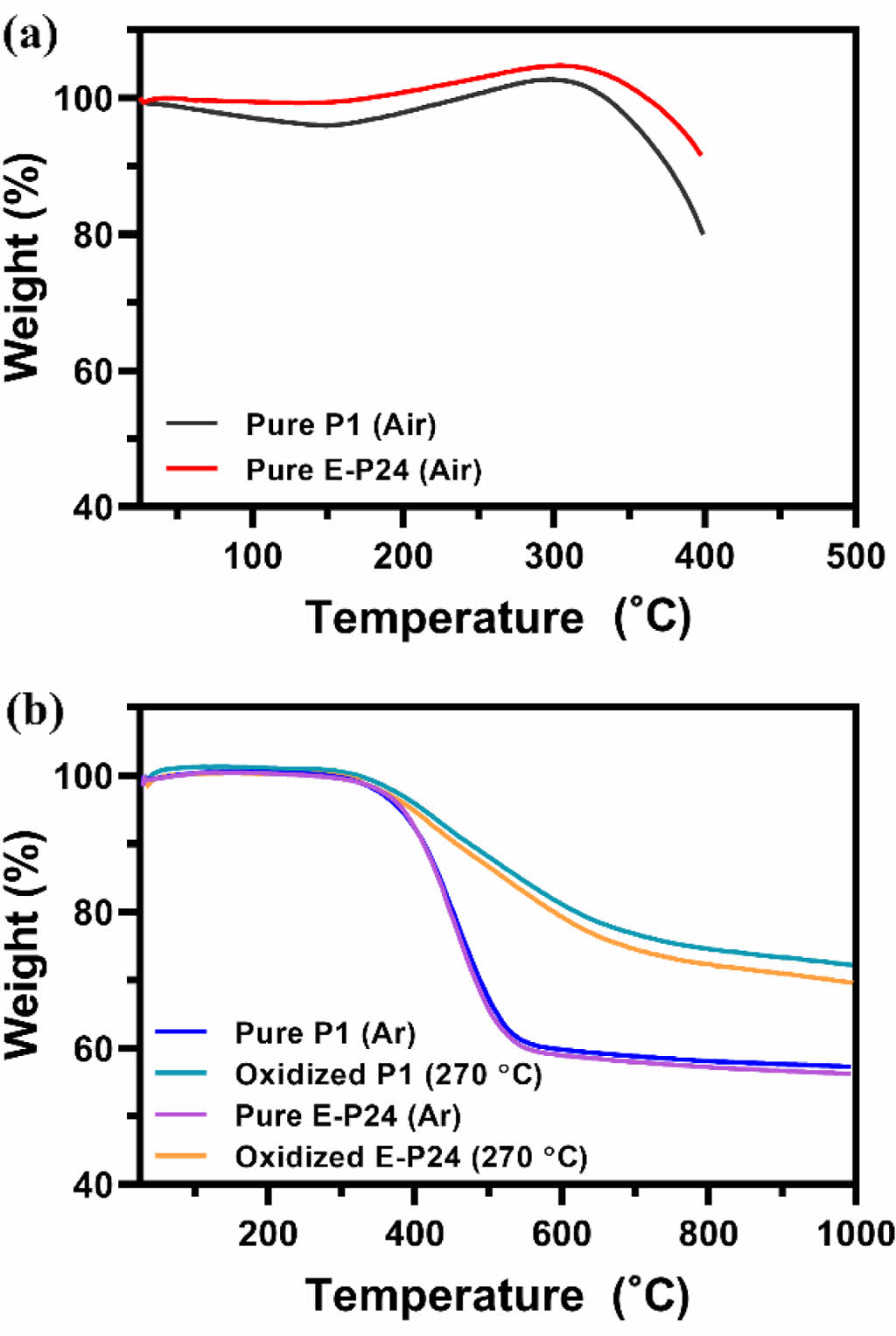The TGA curve of the pitch precursors in the air atmosphere provides further evidence of a greater oxidation reaction response to the E-P24 precursor, as seen in Figure 3(a). Weight exceeding 100% of the pitch precursors in TGA analysis attributes to the introduction of oxygen-containing functional groups in air.17,19 These attachments of the oxygen functional groups in the E-P24 precursor are gained as of 182 ℃ contrast to the P1 precursor from 242 ℃. The weight increment of the E-P24 precursor (%) is higher than that of the P1 precursor, indicating an increase in oxidation reactions in E-P24. These oxidation reactions enhance thermal stability, as evidenced by the TGA curve in a nitrogen atmosphere, shown in Figure 3(b). The weight reduction of both the melt-spun and oxidized precursors begins at approximately 400 ℃. However, the pure precursor exhibits a rapid weight decrease, retaining only 60% of its initial weight, whereas the oxidized precursor forms double bonds that improve heat resistance.11,20 Additionally, the oxidized E-P24 precursor exhibits slightly greater weight loss than the oxidized P1 precursor, which is attributed to the loss of more carbon-oxygen bonding groups during carbonization. As a result, the final carbonized yield of E-P24 is lower (55%) compared to that of the P1 precursor (60%).