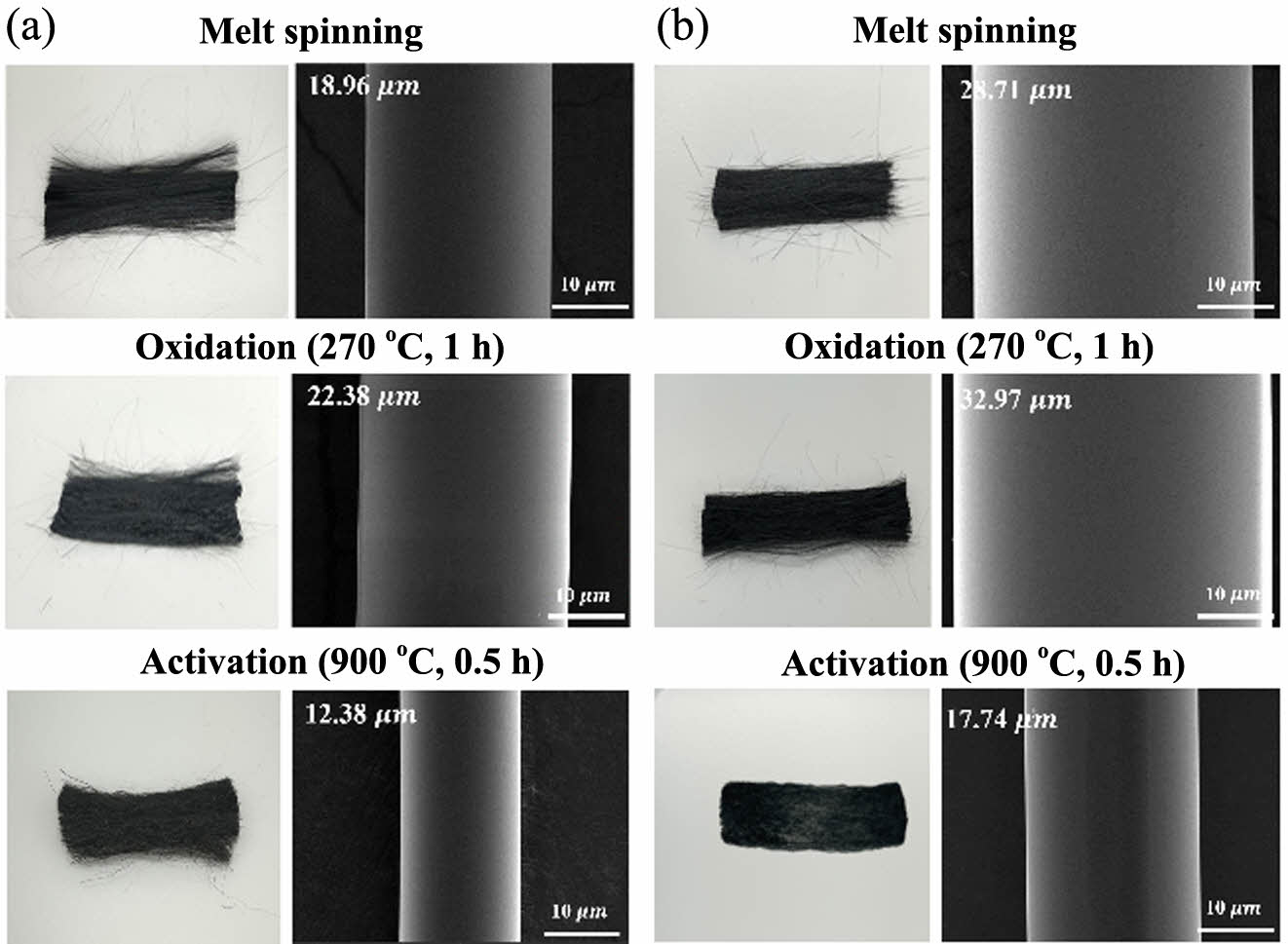 Figure 4 Optical images and SEM images of different types of melt-spun, oxidation, and activation carbon fibers: (a) P1; (b) E-P24. |