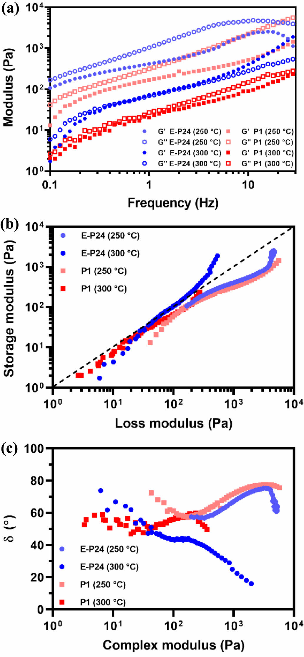 Figure 6(b) further explains melt-spinnability through the slope between G' and G'', represented by the Cole-Cole plot. A linear slope approaching the G'=G'' line indicates a well-balanced relationship between viscosity and elasticity, which enhances fiber melt-spinnability.26 Therefore, increase from 250 ℃ to 300 ℃ is identified as a more suitable temperature for the melt-spinning of pitch. The E-P24 melts demonstrate superior melt-spinnability, as they more closely approach the G'=G'' line compared to the P1 melts.14,26,27