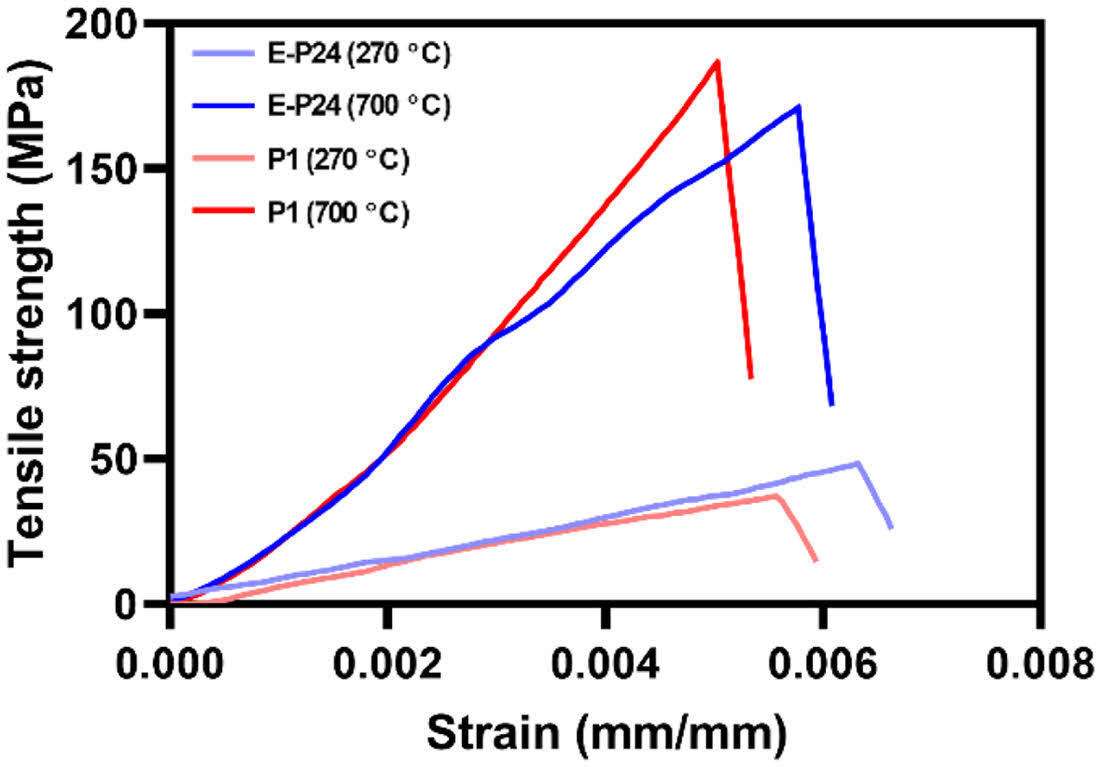 Figure 7 Tensile properties of P1 and E-P24 fibers after oxidation at 270 ℃ and pre-carbonization at 700 ℃. |
