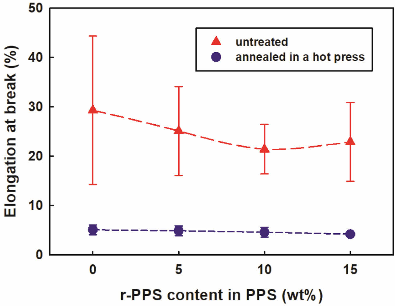 m-PPS/m-POE 블렌드의 인장강도를 Figure 13에 도시하였Figure 14에 m-PPS/m-POE 블렌드의 파단신율을 도시하였다. Annealing하지 않은 경우는 r-PPS 함량이 증가함에 따라 감소하는 것을 볼 수 있었던 반면에 annealing한 경우에는 거의 차이가 없었다. 파단신율의 경우는 계면 접착력이 향상되면 증가하는 것이 일반적이나 annealing을 하지 않은 경우에는 역시 matrix 내의 weak point로 인한 영향이 더 큰 것으로 판단되었다.