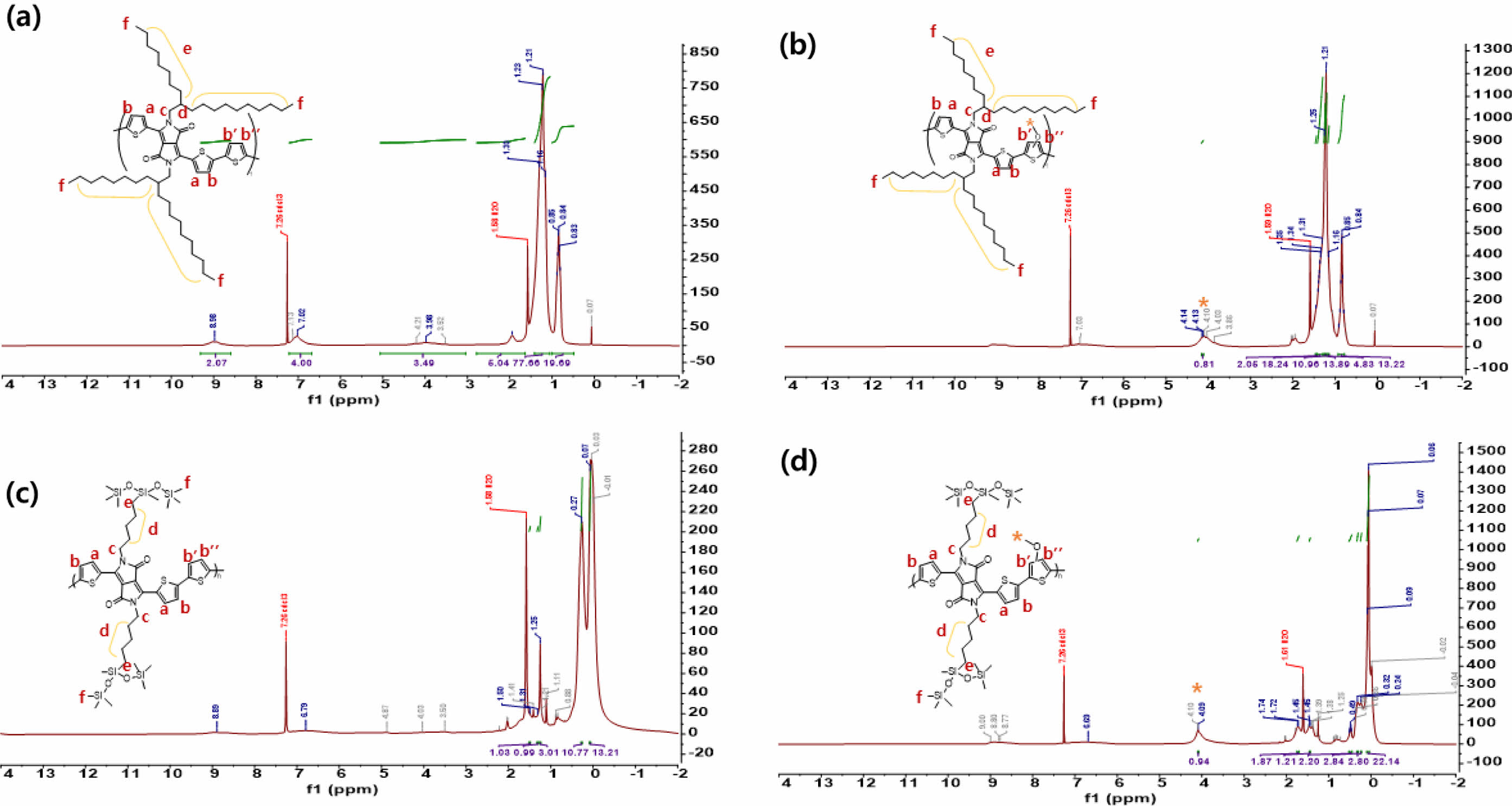 고분자 구조 분석.합성한 고분자의 화학적 구조를 분석하기 위해 600 MHz 푸리에 변환 핵자기 공명 분석을 CDCl3 용매를 사용하여 진행하였다(Figure 1). PTDPPOD-Th와 PTDPPOD-Th의 thienyl diketopyrropyrrole(DPP)의 싸이오펜(thiophene)과 그 옆의 싸이오펜의 방향족 고리의 수소는 9.31-8.59, 7.21-6.67 ppm 영역과 9.34-8.39, 7.21-6.27 ppm 영역에서 각각 나타나는 것을 확인했고, 알킬사슬의 수소는 4.41-3.44, 1.53-0.98, 0.97-0.7 ppm 영역과 4.38-3.62, 1.54-0.98, 0.94-0.7 ppm 영역에서 각각 나타나는 것을 확인하였다. PTDPPsi-Th와 PTDPPsi-Meth의 DPP 양쪽 싸이오펜과 그 그 옆 싸이오펜의 방향족 고리의 수소는 9.22-8.32, 7.03-6.13 ppm 영역과 9.1-8.2, 7.1-6.1 ppm 영역에서 각각 나타나는 것을 확인했고, 알킬사슬 및 실록세인 사슬의 수소는 4.96-3.38, 1.50-1.07, 0.53-(-)0.28 ppm 영역과 4.33-3.5, 1.53-1.16, 0.51-0.06 ppm에서 나타나는 것을 확인하였다. PTDPPOD-Meth와 PTDPPsi-Meth는 methoxy의 수소로 인해 4.38-3.62 ppm과 4.33-3.5 ppm에서 각각 sharp한 피크를 확인할 수 있었고, PTDPPOD-Th와 PTDPPsi-Th의 4.41-3.44 ppm과 4.96-3.38 ppm에서는 매우 약한 피크만 관찰되어 methoxy group에 따른 구조적 차이를 확인할 수 있었다. FT-IR을 통해 합성한 고분자의 작용기와 구조적 특성을 확인하였고 Figure 2에 나타내었다. PTDPPOD-Th, PTDPPOD-Meth, PTDPPsi-Th 그리고 PTDPPsi-Meth의 sp2/sp3 혼성 탄화수소의 C-H 신축(stretching) 진동 피크를 3074/2920, 3065/2920, 3066/2955 그리고 3074/2955 cm-1 영역에서 각각 관찰하였고, DPP의 이미드(imide)에 해당하는 C=O 신축진동 피크를 1663, 1660, 1663, 1660 cm-1 영역에서 각각 확인하였다. DPP의 방향족 아민(aromatic amine)에 해당하는 C-N 신축진동 피크가 1227, 1227, 1249, 그리고 1249 cm-1 영역에서 관찰되어 고분자의 구조적 특성을 확인할 수 있었다. PTDPPsi-Th와 PTDPPsi-Meth는 siloxane곁사슬로 Si-O-Si, Si-C 신축진동 피크가 동일하게 1034 cm-1와 834 cm-1 영역에서 확인되었고, PTDPPOD-Meth와 PTDPPsi-Meth는 methoxy로 인한 alkyl aryl ether에 해당하는 C-O 신축진동 피크가 1320, 1330 cm-1 영역에서 각각 확인하였다.