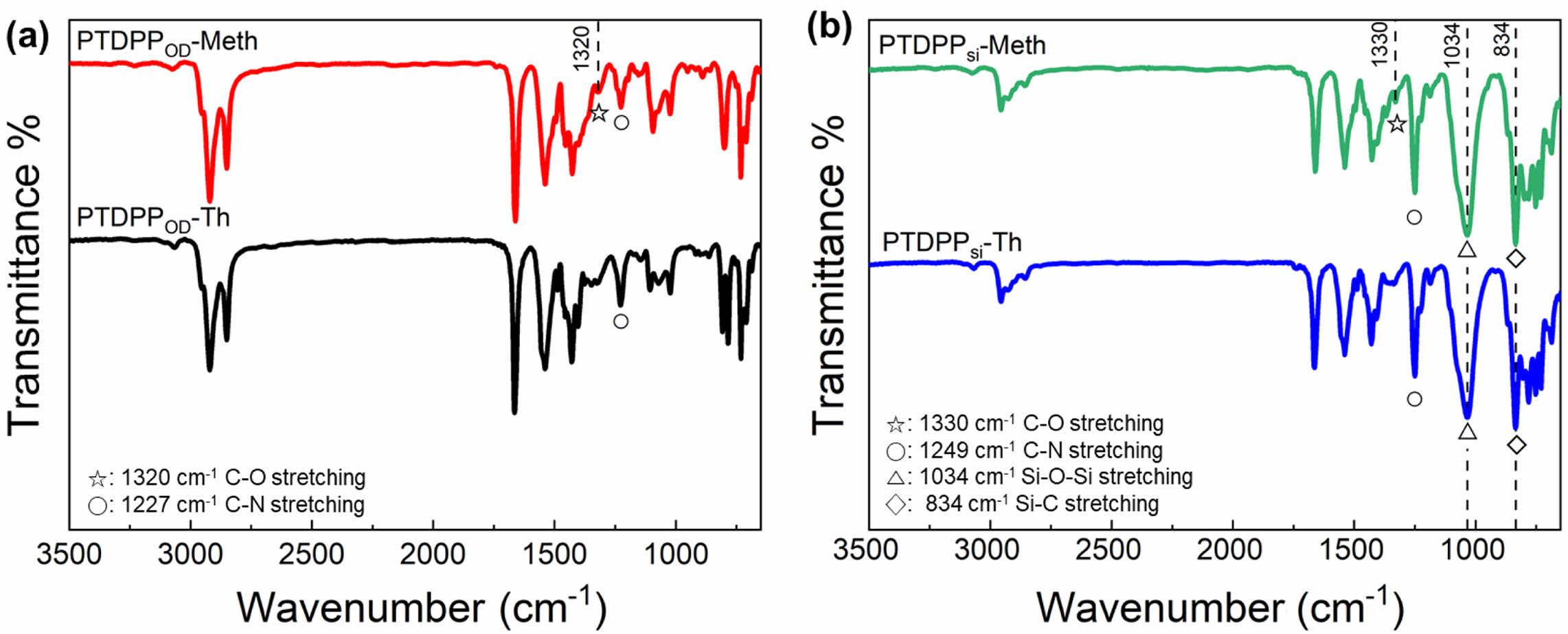 Fourier transform infrared (FTIR) spectra for (a) PTDPPOD-Th, PTDPPOD-Meth; (b) PTDPPsi-Th and PTDPPsi-Meth