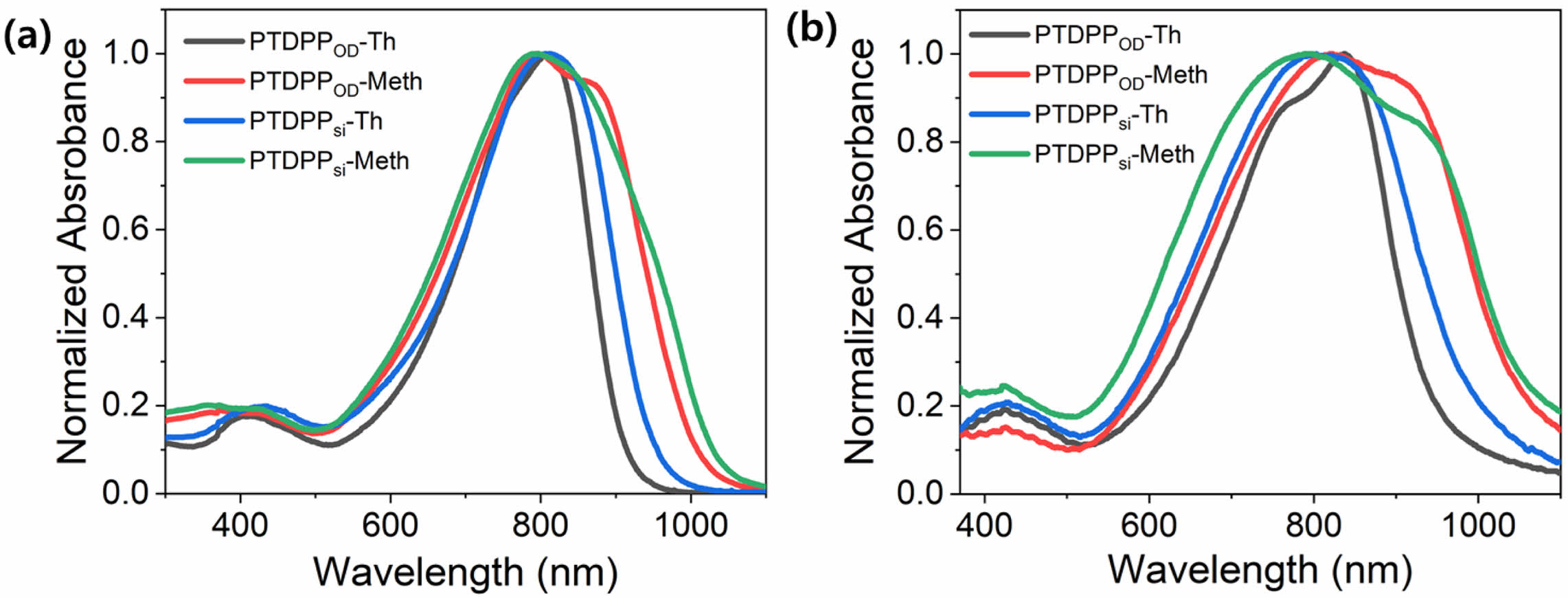 Normalized UV-Vis-NIR absorption spectra of PTDPPOD-Th, PTDPPOD-Meth, PTDPPsi-Th and PTDPPsi-Meth: (a) in dilute chloroform solution; (b) as thin films on a quartz plate.
