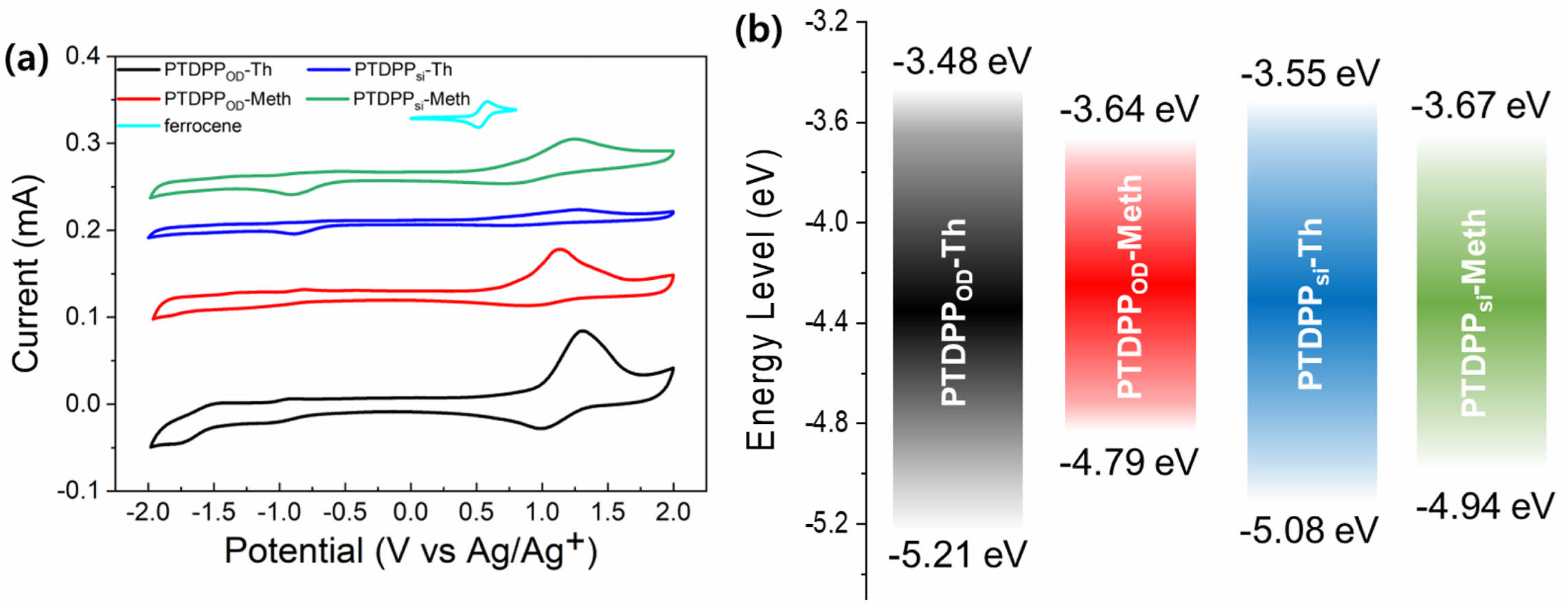(a) Cyclic voltammograms; (b) energy diagram of PTDPPOD-Th, PTDPPOD-Meth, PTDPPsi-Th and PTDPPsi-Meth.