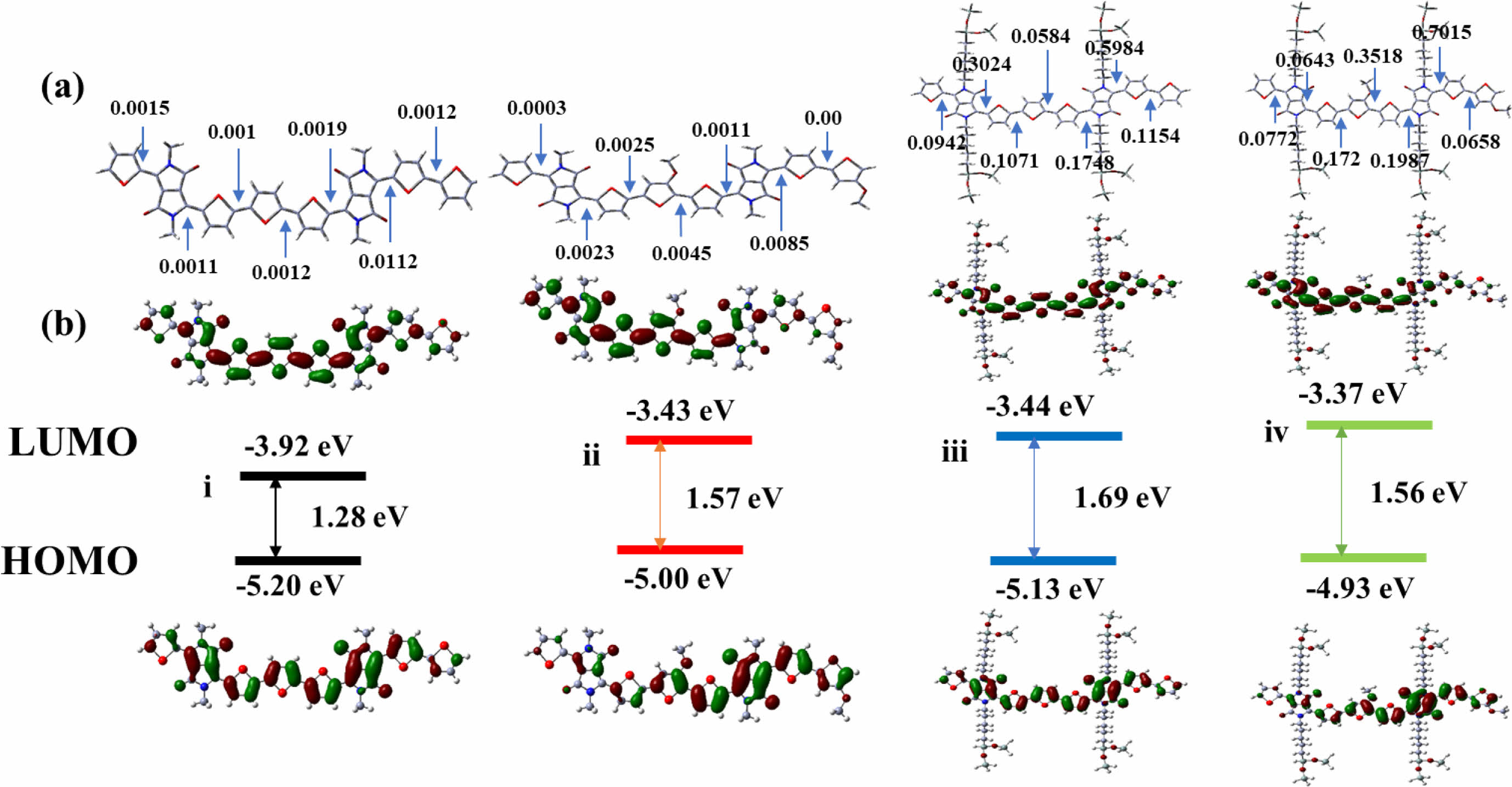 (a) Density functional theory (DFT) optimized geometries and charge-density isosurfaces and values of HOMO and LUMO levels of PTDPPOD-Th (ⅰ), PTDPPOD-Meth (ⅱ), PTDPPsi-Th (ⅲ) and PTDPPsi-Meth (ⅳ); (b) Calculated dihedral angles of model dimers.