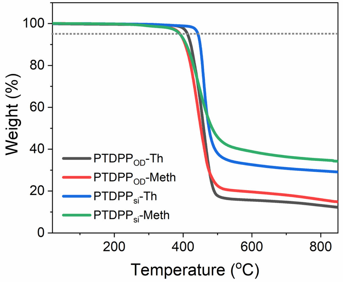 고분자 열적분석. 합성한 고분자의 열적 안정성을 확인하기 위해 열분해온도를 측정하여 확인하였다. TGA를 이용하여 질소 분위기에서 상온(16 ℃)에서부터 900 ℃까지의 온도범위로 10 ℃/min의 속도로 승온하였을 때 온도에 따른 질량 감소율을 측정하고 Figure 6와 Table 1에 나타냈다. 고분자의 열분해 온도(decomposition temperature, Td) 값은 5% 중량 감소율을 보인 지점을 측정하였으며, PTDPPOD-Th, PTDPPOD-Meth, PTDPPsi-Th, PTDPPsi-Meth의 Td 값은 410, 383, 441, 383 ℃으로 확인하였다. 싸이오펜을 단량체로 갖는 고분자 PTDPPOD-Th와 PTDPPsi-Th는 methoxy 싸이오펜을 갖는 고분자 PTDPPOD-Meth보다 더 높은 Td 값을 갖는 것을 확인하였고 이는 열적으로 더 안정하다는 것을 확인하였다.