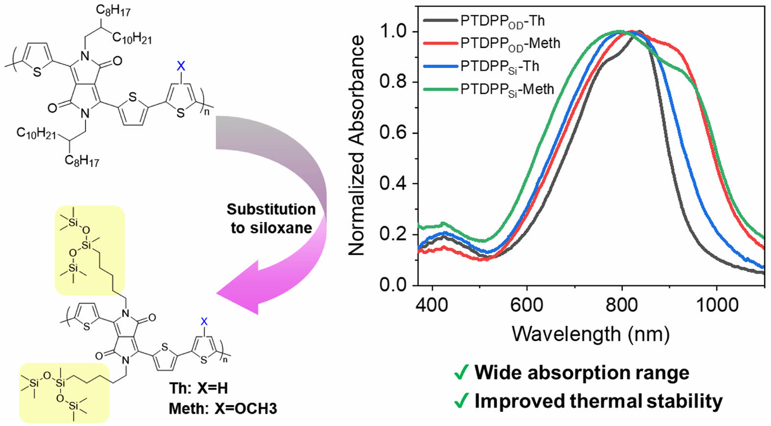 We examined how siloxane and methoxy substituents affected the physical and chemical characteristics of four thiophene (T) or methoxy thiophene and diketopyrrolopyrrole (DPP) copolymers. Polymers containing siloxane chain groups have better thermal stability and absorption, suggesting they might be used to make very stable organic semiconductors.