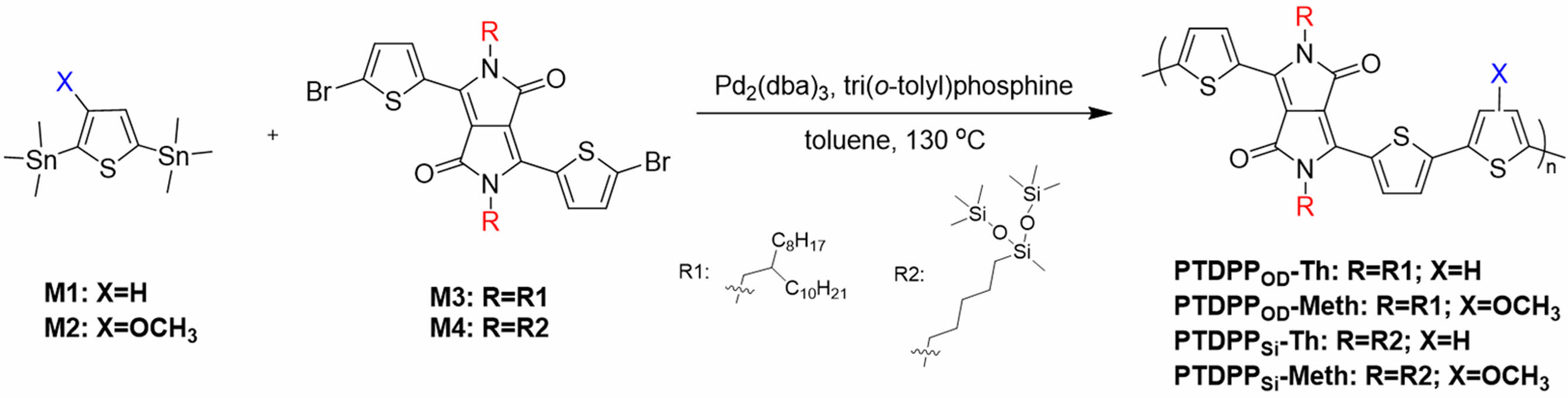 고분자 합성. Scheme 1에서 보는 것과 같이 2,5-bis(trimeth- ylstannyl)thiophene(M1) 또는 (3-methoxythiophene-2,5-diyl) bis(trimethylstannane)(M2)과 3,6-bis(5-bromothiophen-2-yl)-2,5-bis(2-octyldodecyl)pyrrolo[3,4-c]pyrrole-1,4(2H,5H)-dione (M3) 또는 3,6-bis(5-bromothiophen-2-yl)-2,5-bis(5-(1,1,1,3,5,5,5- heptamethyltrisiloxan-3-yl) pentyl) pyrrolo[3,4-c]pyrrole-1,4 (2H,5H)-dione(M4)를 각각 1:1 몰수 비율로 toluene에 용해 시켜 Pd(PPh3)4을 촉매로 사용하여 Stille 중합 반응(Stille cross coupling polymerization)을 통해 4종의 전도성 고분자 PTDPPOD-Th(M1, M3), PTDPPOD-Meth(M2, M3), PTDPPsi-Th(M1, M4), PTDPPsi-Meth(M2, M4)를 각각 75%, 70%, 50%, 70%의 수득률로 합성하였다. Gel permeation chromatography(GPC)을 통해 합성한 고분자의 수평균 분자량(Mn)을 측정하였고, 각각 66.3, 14.2, 173.6 그리고 16.7 kg/mol로 측정되었다(Table 1, Figure S1, Table S1).