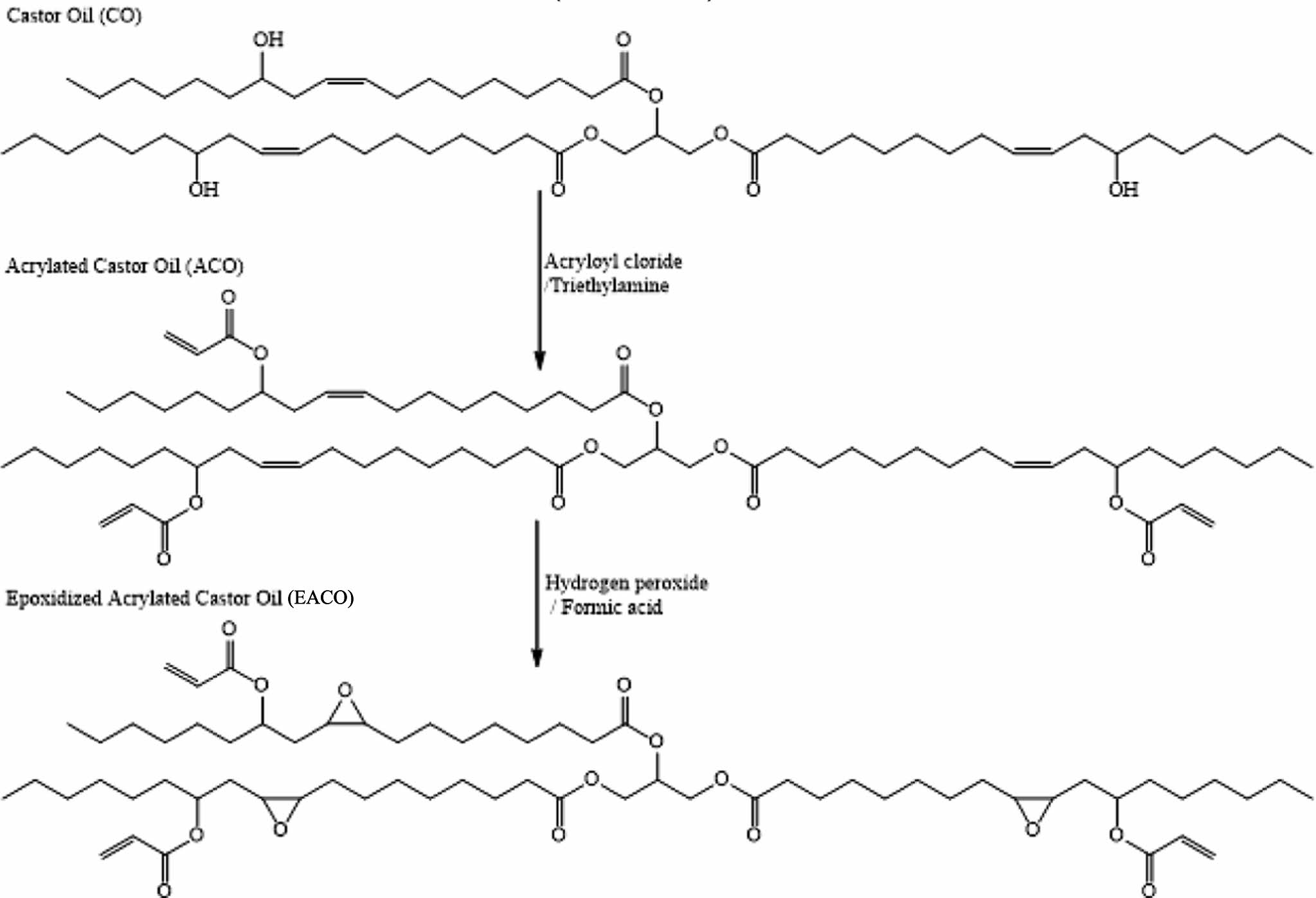 Synthesis of Epoxidized Acrylated Castor Oil (EACO). Epoxidized acrylated castor oil was synthesized according to literature.37,38 A solution was prepared by combining 10 g of acrylated castor oil (equivalent to 0.0092 mol) with 4.00 g of formic acid in a 250 mL flask. Subsequently, the mixture was cooled to a temperature of 0 ℃. While agitating this mixture, 5.66 g of a 50% hydrogen peroxide (H2O2) solution was added at a temperature ranging from 0 to 5 ℃. The combination was allowed to stand at a temperature of 0 ℃ for a duration of 1 h. Subsequently, the mixture was stirred for 16 h at ambient temperature. Upon finishing the reaction, the final product was dissolved in 50 mL of dichloromethane and transferred to a separatory funnel. It was then subjected to a series of washes using different solutions. Initially, the product underwent a washing process using approximately 50 mL of distilled water. Subsequently, the product was rinsed with a 50 mL solution of sodium bicarbonate, with a concentration of 5%. Next, the organic layer was rinsed with 50 mL of a concentrated sodium chloride solution. The layer of dichloromethane was dehydrated using anhydrous sodium sulfate. The sodium sulfate was separated by filtration and the dichloromethane was removed by evaporation.