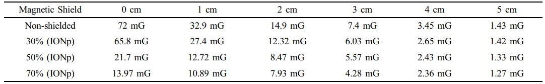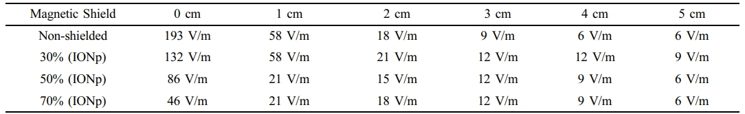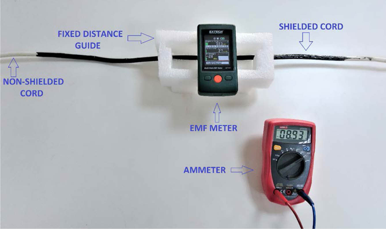 Electrical Cord Measurements. The electrical cord is coated with magnetic paint, which contains different quantities of IONP’s. Cable sections that are not protected and have been coated with bio-based epoxy paint that contained 30%, 50%, and 70% IONP’s are tested. The load current is measured at 8.93A and maintained at a constant value for all samples. The EMF meter is moved at varying distances from the cable, and the related EMF values are documented. Table 1 presents the recorded magnetic field measurements of the electrical cord.