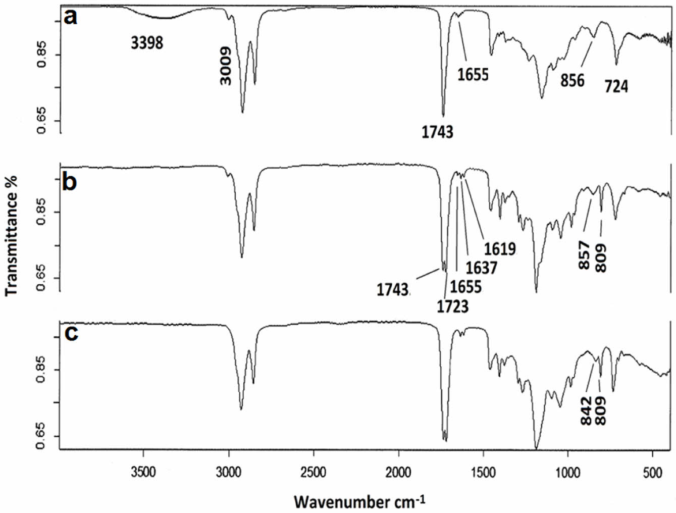 FTIR spectrum of a-castor oil, b-acrylated castor oil and c-epoxidized acrylated castor oil.