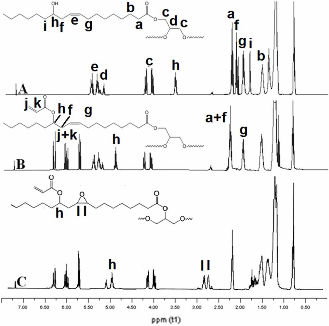1H NMR spectrum of A-castor oil, B- acrylated castor oil and C-epoxidized acrylated castor oil.