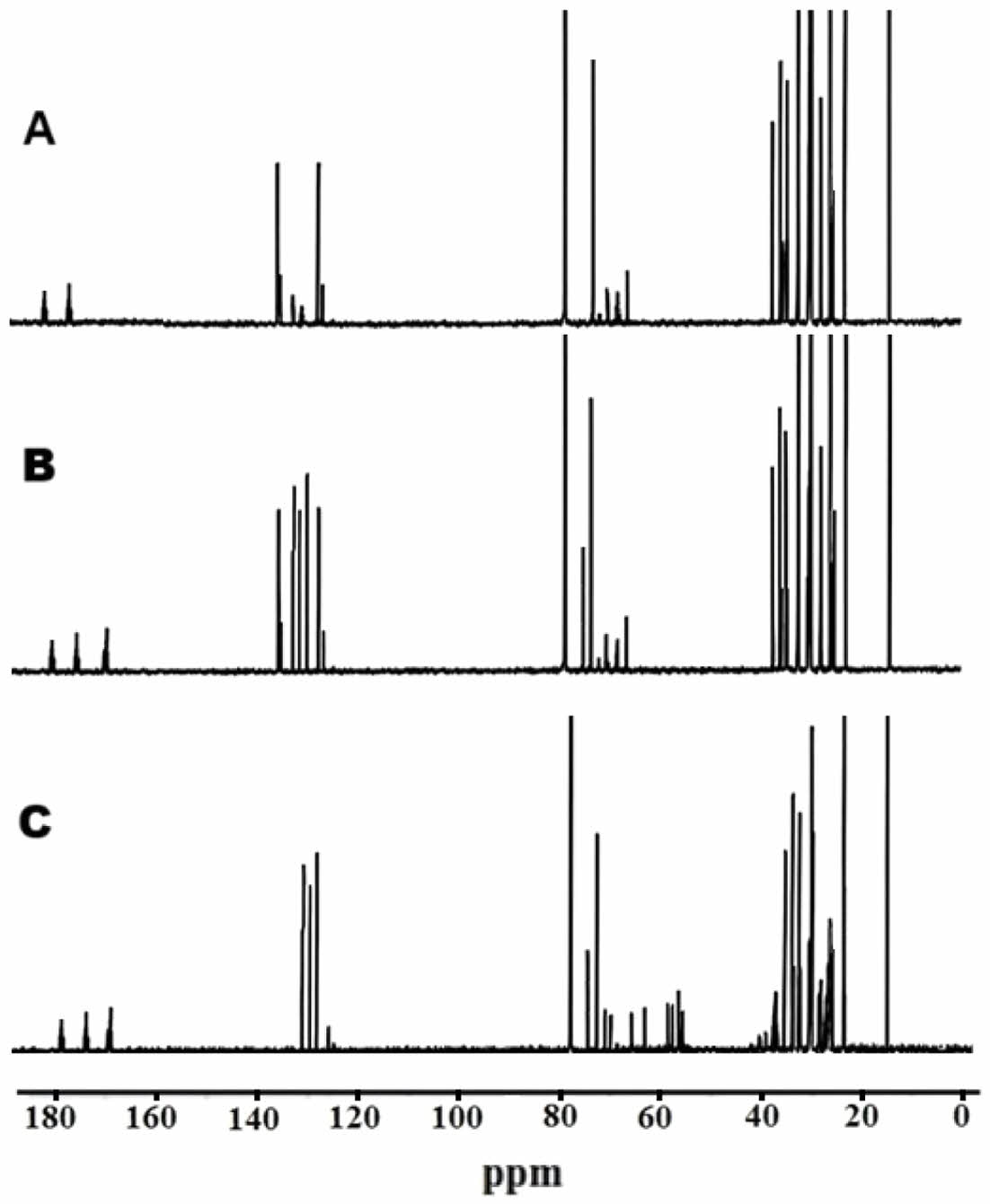 13C NMR spectrum of A-castor oil, B- acrylated castor oil and C-epoxidized acrylated castor oil.