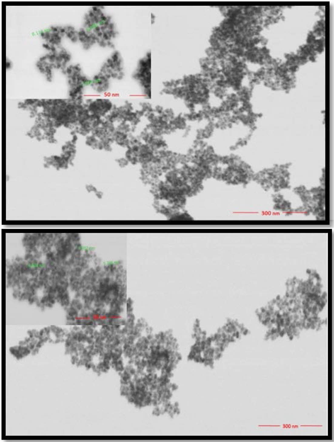 High-resolution surface characterization of IONP and oleic acid coated IONP was performed by using FE-SEM/STEM under high vacuum. Each nanoparticle was suspended in water at a ratio of 1/10 and dropped onto a carbon film-coated copper grid (TED PELLA, Pure carbon film 300M Cu). Images were taken at 300 nm-50 nm scales using 30 kV and 1 spot size. STEM images of the materials synthesized are shown in Figure 10. The combination of FeCl3·6H2O and FeCl2·4H2O produced nanoparticles with a spherical shape and a size of approximately 7 nm. After undergoing the modification process using oleic acid, the globular structure remained intact, albeit with an increase in particle size to approximately 9 nm.