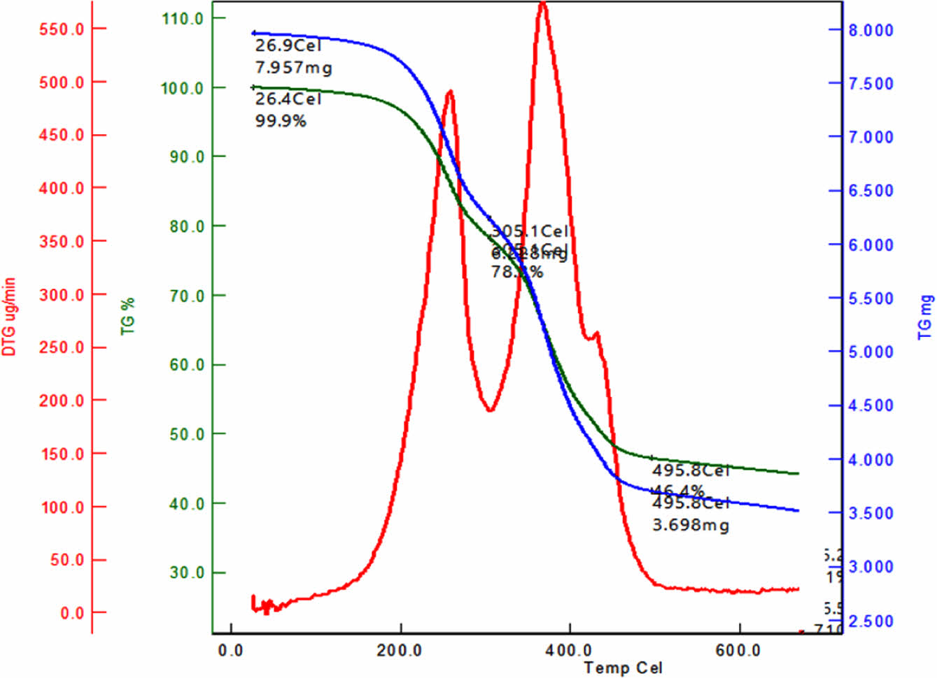 TGA technique was also used to characterize iron oxide nanoparticles. TGA analysis is conducted using the TA Q50 instrument with a heating rate of 10 ℃/min in a nitrogen atmosphere. Thermogravimetric analysis is conducted on iron oxide nanoparticles covered with a protective layer. The analysis is carried out in a nitrogen atmosphere, with a heating rate of 10 ℃ per minute, starting at ambient temperature and reaching a maximum temperature of 700 ℃. The TGA thermogram, which is depicted in Figure 11, indicated that iron oxide nanoparticles coated with oleic acid exhibited two distinctive weight loss at temperatures at 205 ℃ and 305 ℃.40 Char yield of coated iron oxide nanoparticles was measured 45% at 700 ℃.