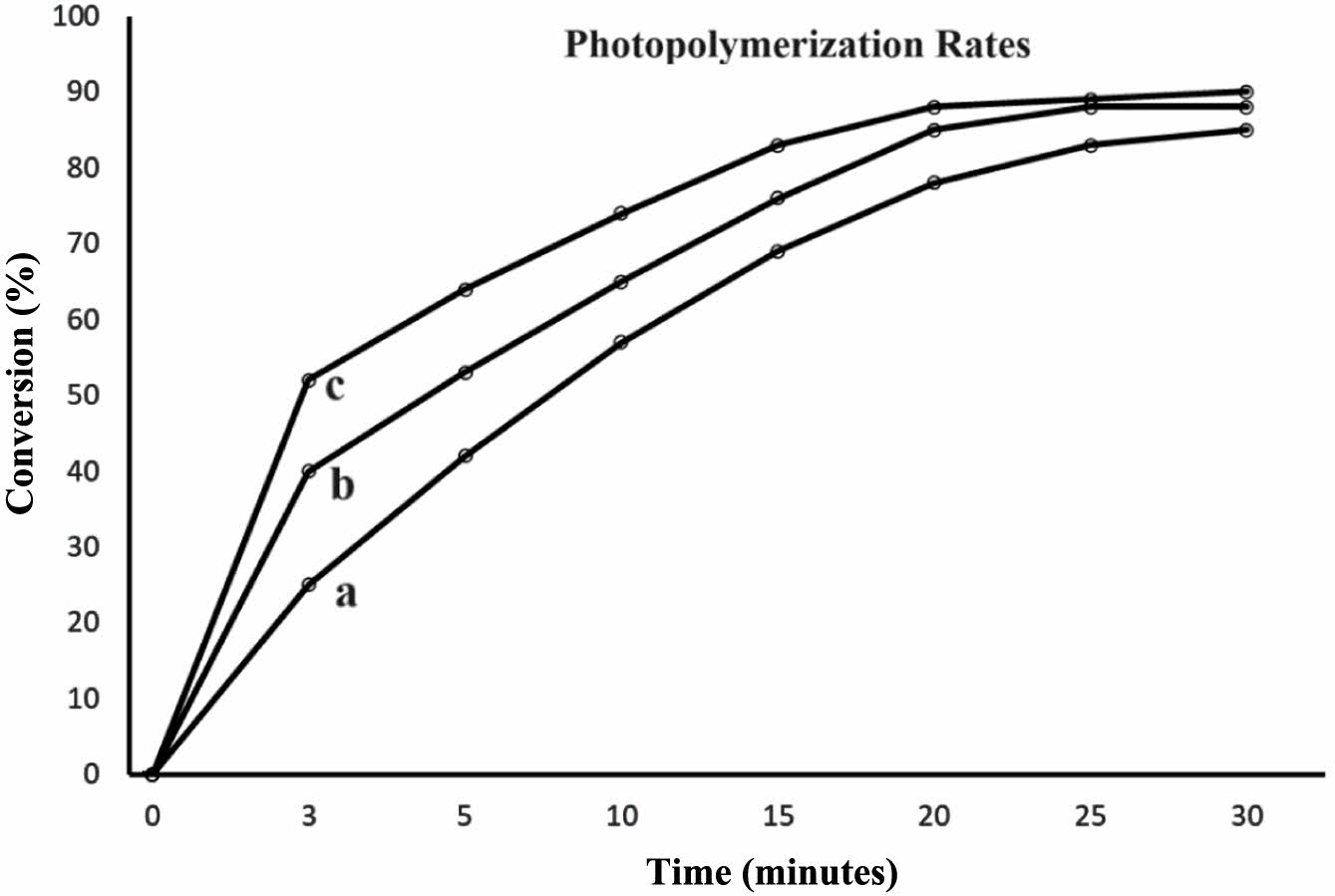 Photopolymerization rates of bio-based epoxy resin with a-0.5% photoinitiator, b-1% photoinitiator, a-3% photoinitiator.