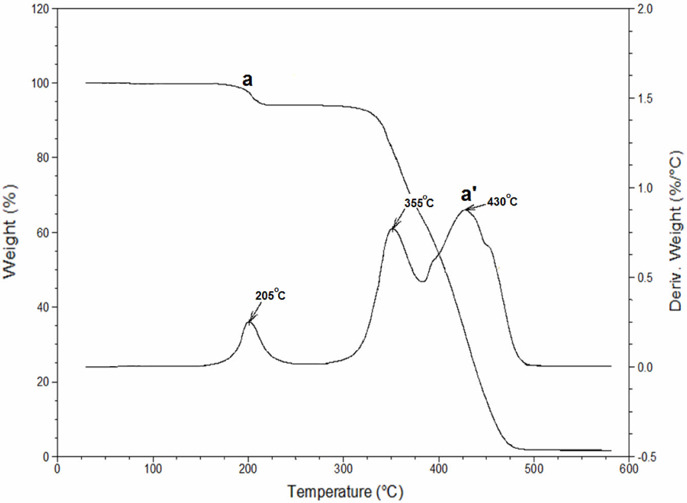 TGA thermogram: (a) and derivative TGA curves (a’) of bio-based epoxy paint matrix.