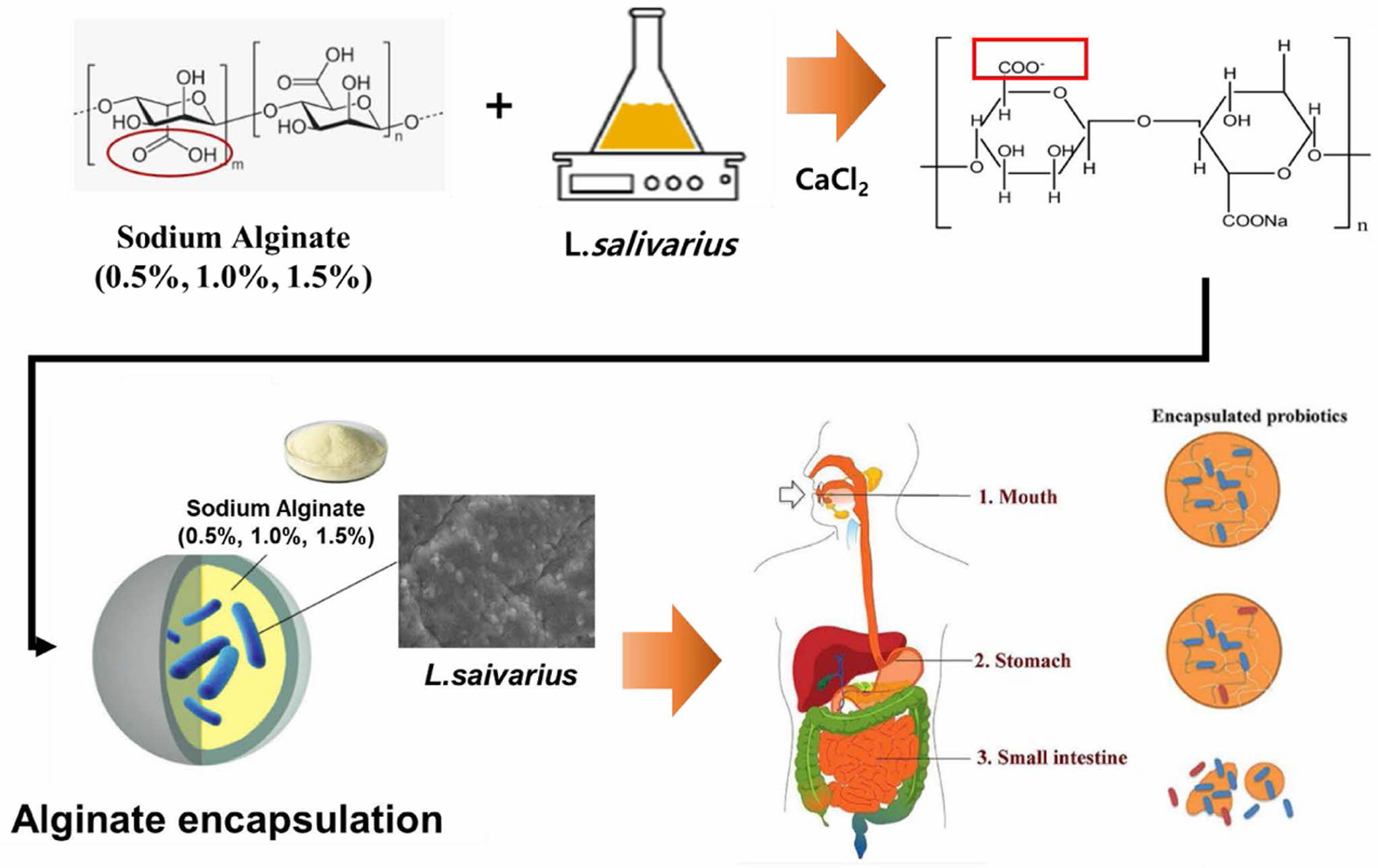 본 연구의 목적은 소화과정에서의 L. salivarius의 생존율을 높이고, 피해를 줄이기위해 알긴산을 이용해 캡슐화 하였을 때 위액과 장액에서 캡슐의 강도 변화를 조사하여, 위장관에서의 특성을 확인하고, 유산균 캡슐화하였을 때 장내 생존율을 조사하여 알긴산 캡슐의 효율을 평가하고자 한다(Figure 1).
