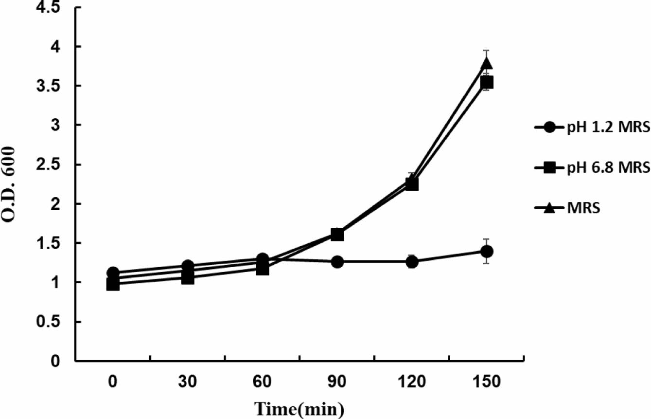 유산균의 생장 곡선 및 내산성. L. salivarius의 pH에 따른 성장 곡선을 확인하기 위해 pH 1.2와 pH 6.8로 조절된 MRS배지 각각 100 mL를 준비하였다. 준비된 배지 100 mL에 L. salivarius 10 mL를 접종하였으며, 초기 유산균의 OD(Optical Density)값을 1.0으로 맞춘 뒤, 30분 간격으로 측정하여, 유산균의 내산성을 평가했다.