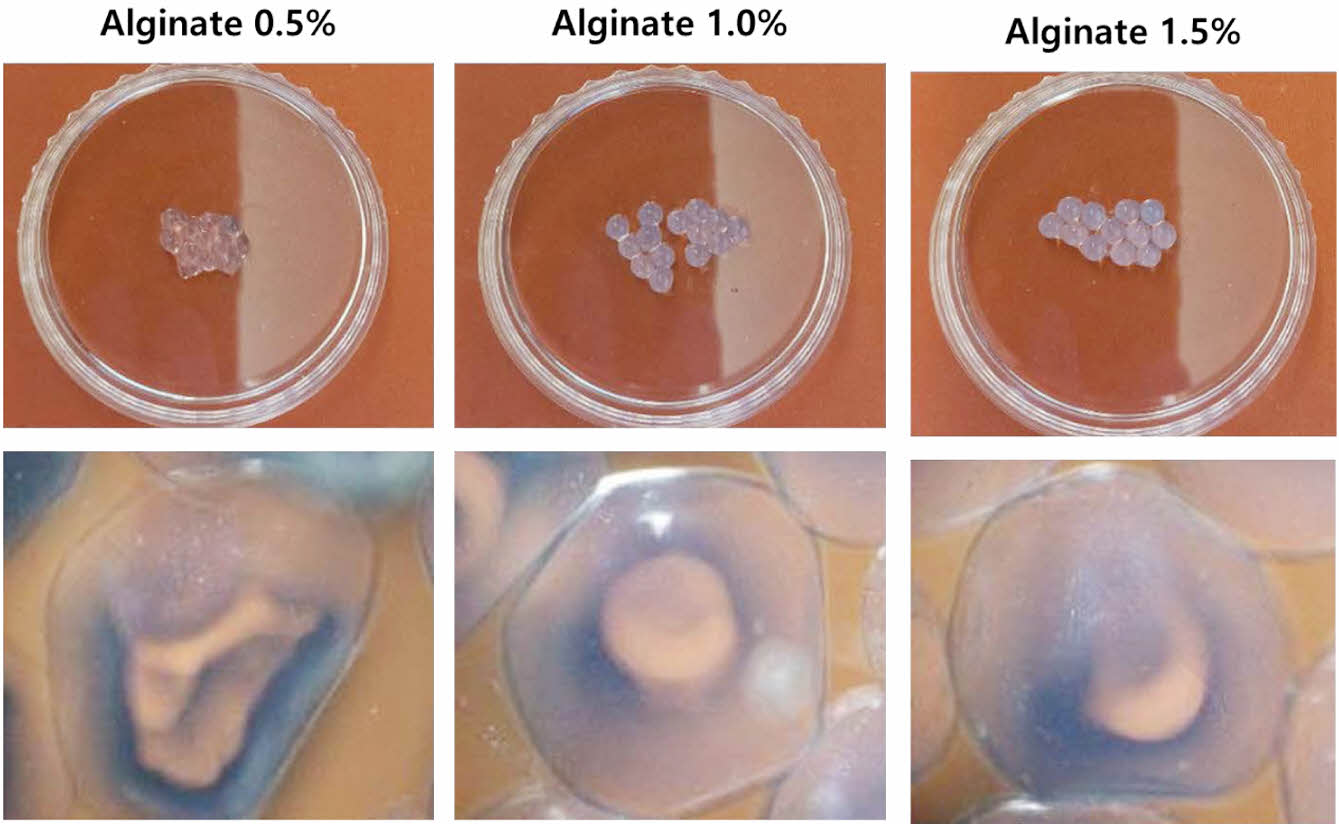 Alginate 농도에 따른 캡슐 특성 분석. Figure 3은 알긴산의 농도에 따른 캡슐 형상을 위상차 현미경을 통해 관찰하였다. 0.5% 알긴산의 경우 표면이 불균일하며, 매끄러운 구형을 유지하지 못하였다. 반면, 1.0%와 1.5% 알긴산에서는 0.5%알긴산에 비교적 균일하고 둥근 형태에 가까운 캡슐을 형성하게 되었다. 위 결과로서로 알긴산의 농도가 높을수록 규칙적인 구형의 형태를 이루고 높은 강도를 갖는 것으로 확인되었다.17